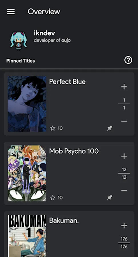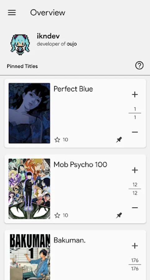 Any time you read a chapter or watch an episode of a certain title, use oujo to update your progress in a matter of seconds.
