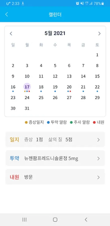 ○ Calendar: You can check your symptom log, medication contents, and visit schedule at a glance on the calendar.