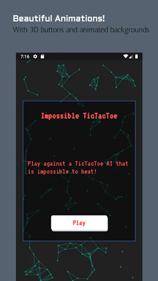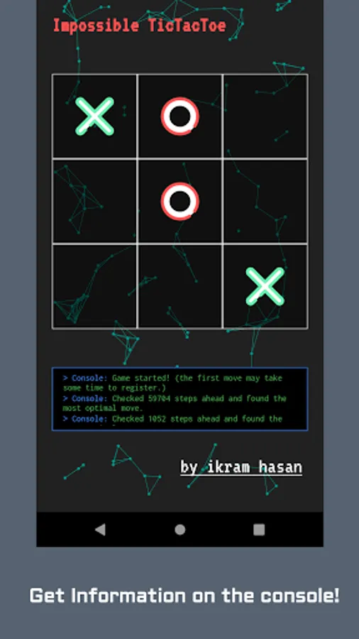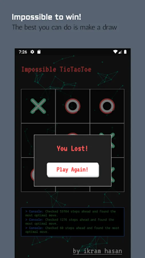 This game uses a MiniMax algorithm with alpha-beta pruning that checks all the possible outcomes and chooses the most optimal one. It is impossible to win against it. The best you can do is make a draw.