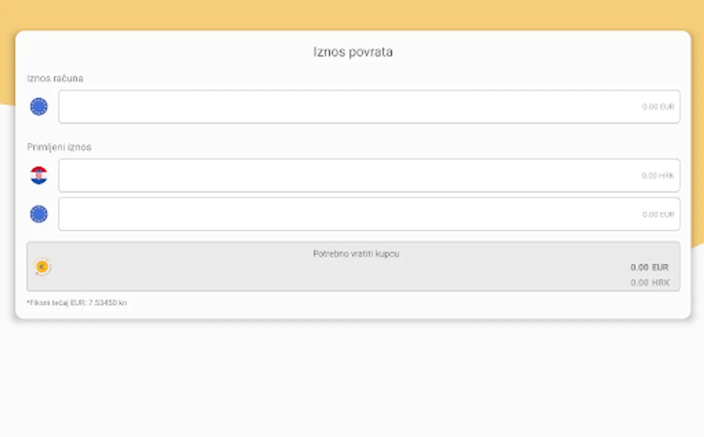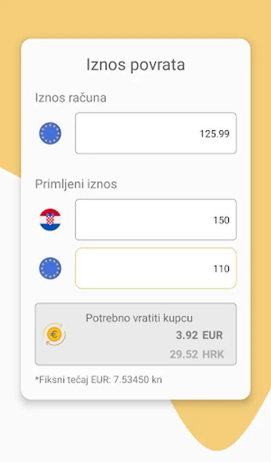 Kalkulator koji automatski računa iznos povrata novca koji je potrebno vratiti kupcu. Upišite iznos vašeg računa te iznos u kunama i/ili eurima koji ste zaprimili od kupca te će kalkulator automatski prikazati koliko morate kupcu vratiti novca.