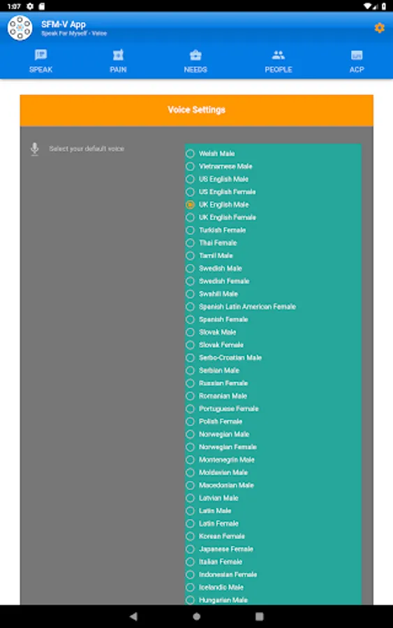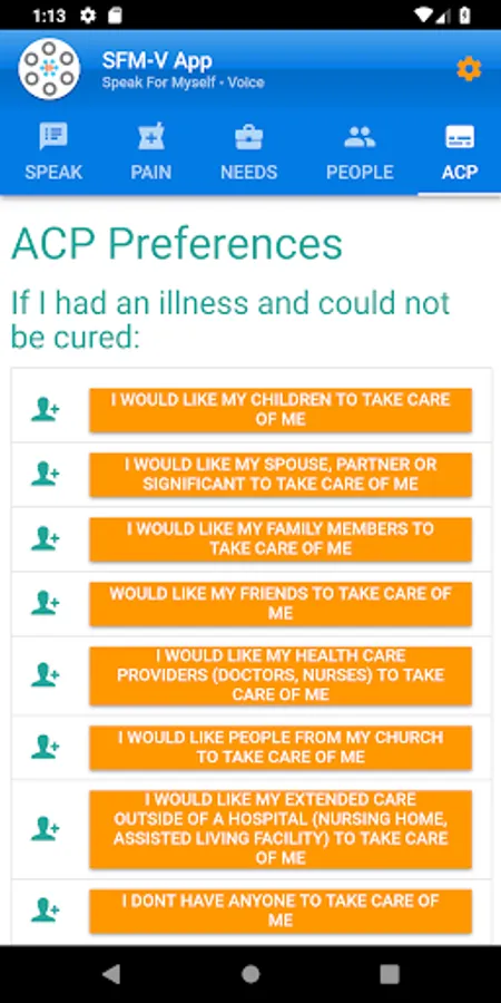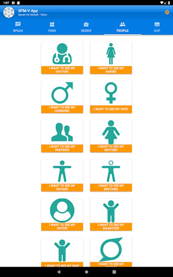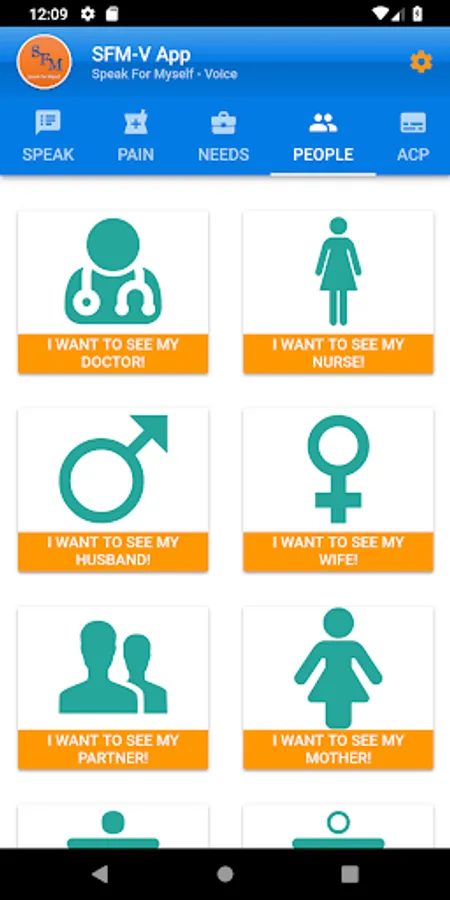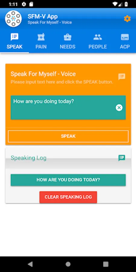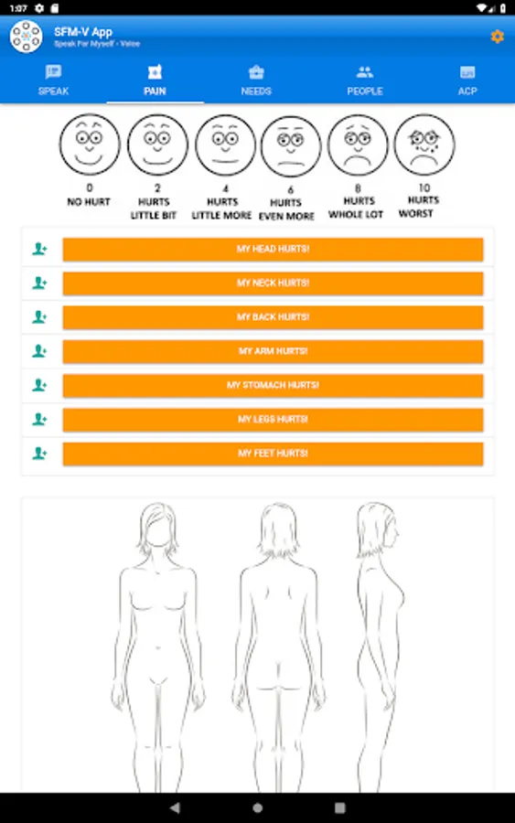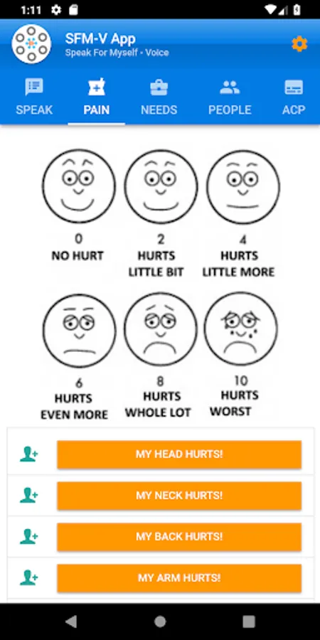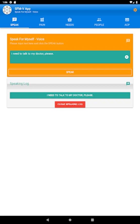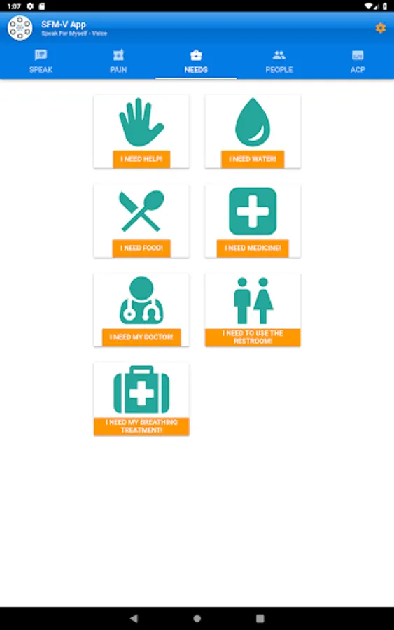 SFM-V is a communication app designed for patients who are unable to speak due to mechanical ventilation, tracheostomy, head and neck trauma, obstruction, or communication disabilities. SFM-V supports patient-provider communication and empowers patients through clarification of needs, preferences, and choices.