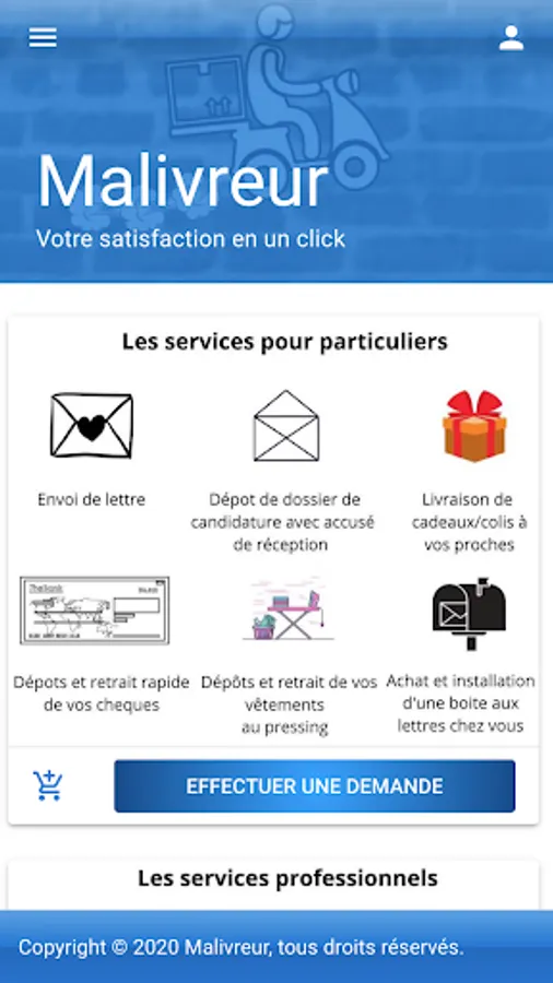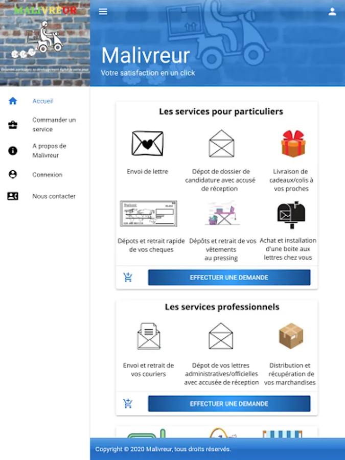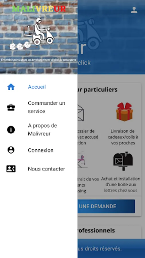 Malivreur is an application that offers shopping, transport and home delivery services in Mali. It offers its users, whether private or professional, a range of choices and services to make their daily lives easier.