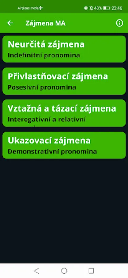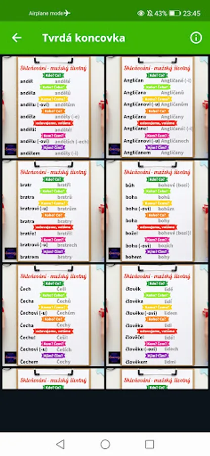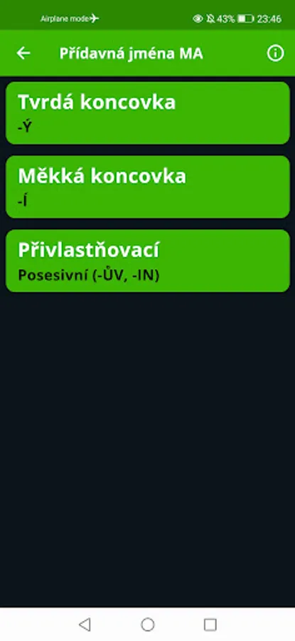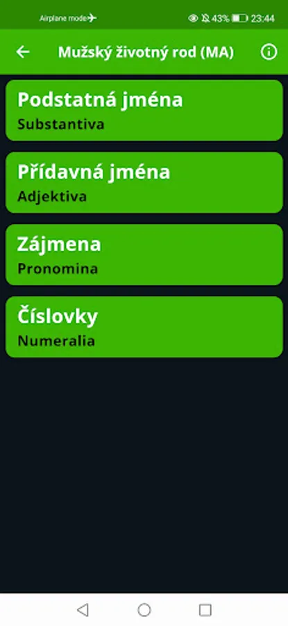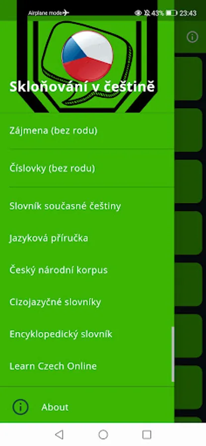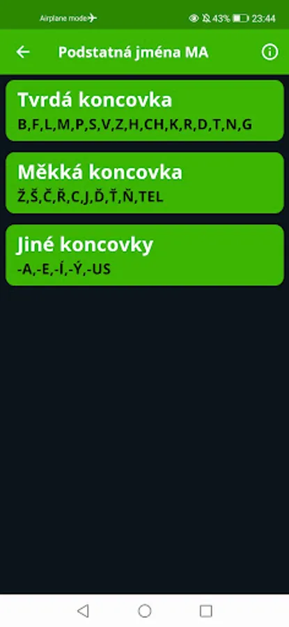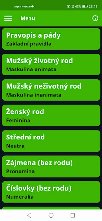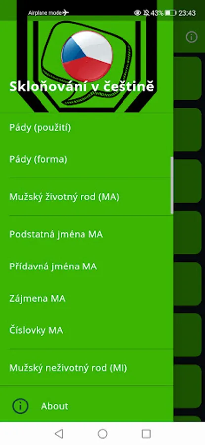 At the end, you will find pronouns and numerals that can be inflected, but we do not distinguish between genders, and links to useful online resources where you can find declensions of words that are not in the application, and other information about Czech grammar.