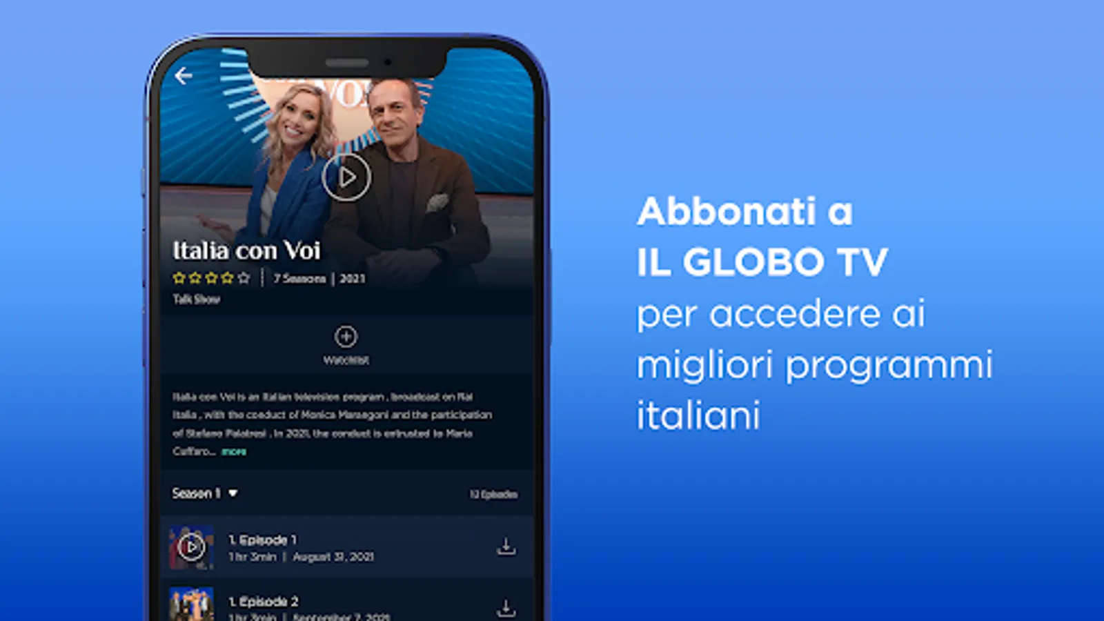 Il Globo TV is the Italian streaming platform for Italians living around the world and for people who love Italy, its culture and its beauty. With live channels from Italy including Rai Italia, Rai Premium, Rai News 24, Mediaset Italia, LA7 Italia, TGCOM24 and more. Plus movies, documentaries, local interviews and segments, Il Globo TV is tailored for you.