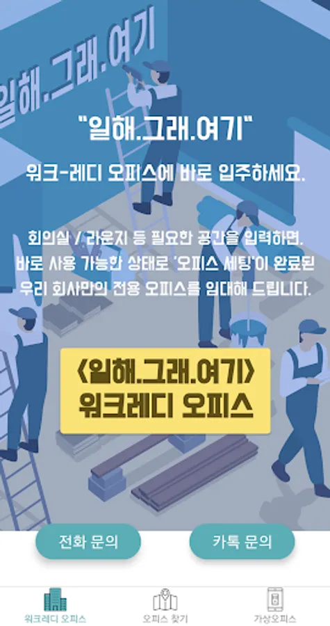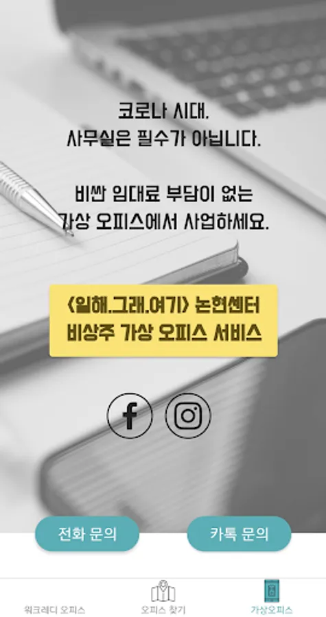 〈Work.Yes.Here〉 The mobile app is an app that allows you to inquire about work-ready office and virtual office services among various services of the office platform. After installing the app, simply fill out the necessary information for the office and apply. The person in charge of 〈Work.Yes.Here〉 will think about it and suggest the best office service for the customer.