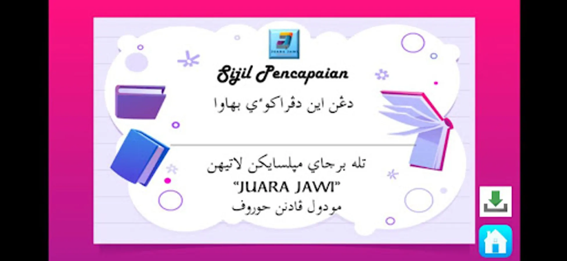 The contents of JUARA JAWI - Letter Matching is developed based on the KPM's Java Excellence Camp module. It contains notes and exercises that use drill methods that suit the needs of students to master the basic concepts of Jawi literacy.