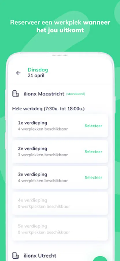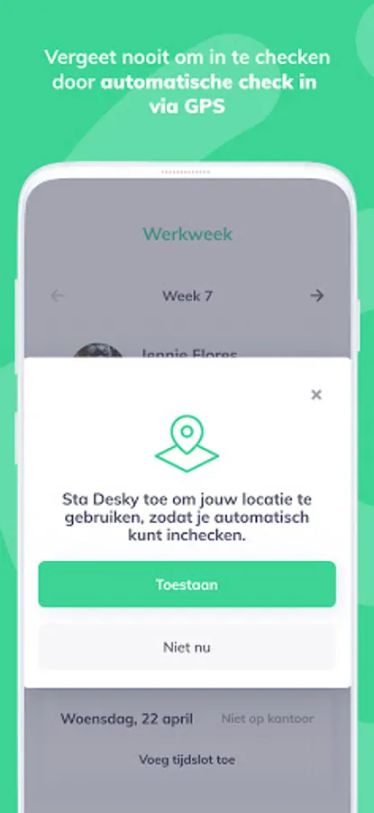 With the Desky app you can quickly and easily reserve a workplace at the office when it suits you. Select a day on which you want to reserve a workplace. Then choose a location, time slot, the number of guests and reserve your workplace. When you arrive at the office, the app automatically checks in via GPS.