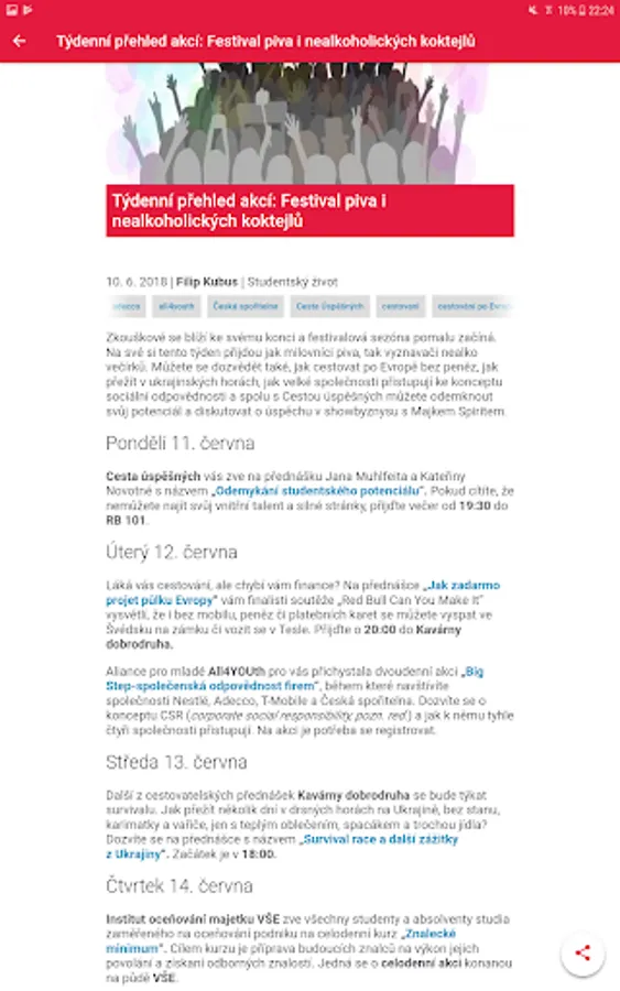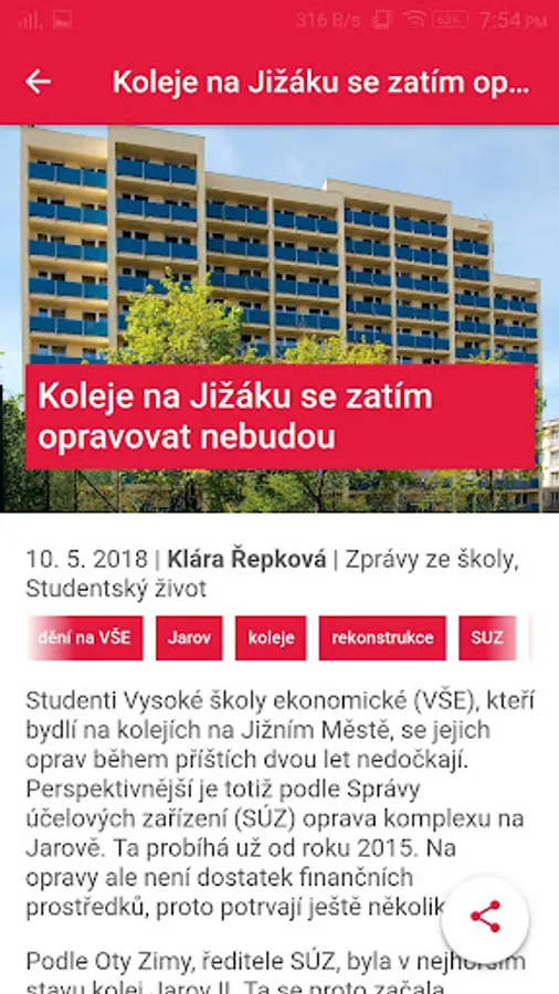With our application, you will not miss news about school, teaching, college and student life. We will help you choose the side or read about the students' experience with Erasmus. We do not forget freshmen either. You can read a special freshman number right now and browse through articles in the freshman section. You can read about sports at VŠE, culture or travel here.