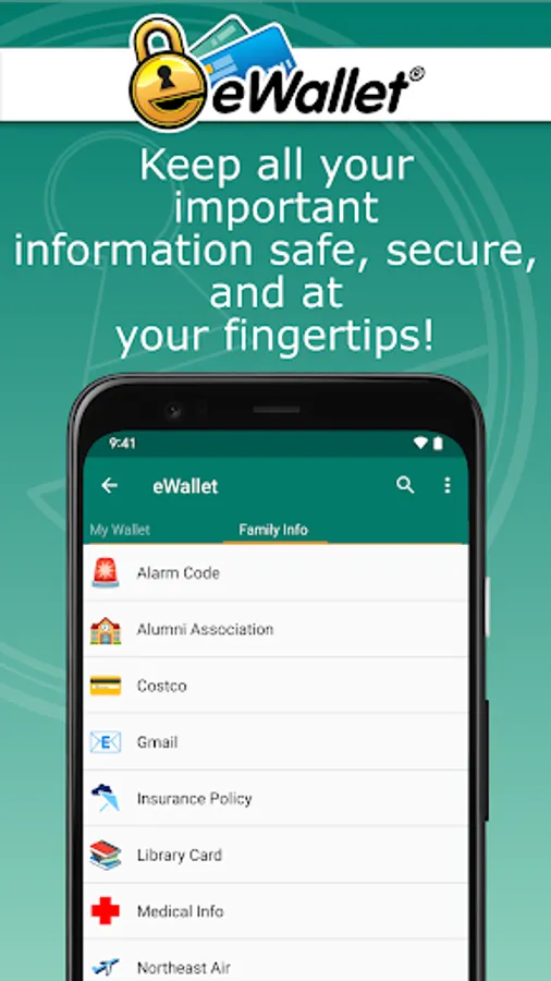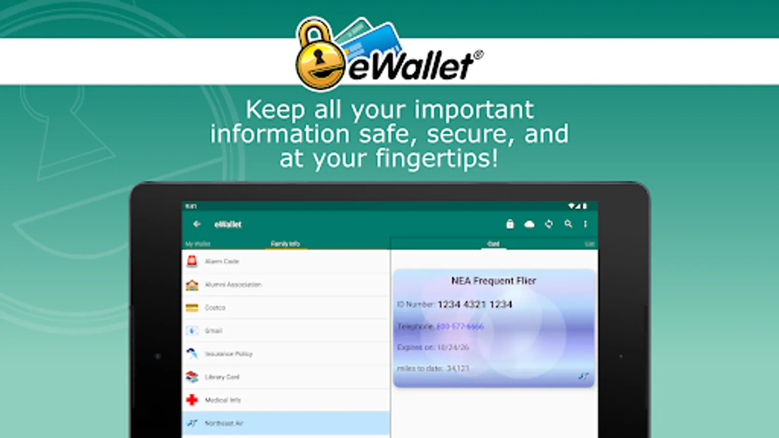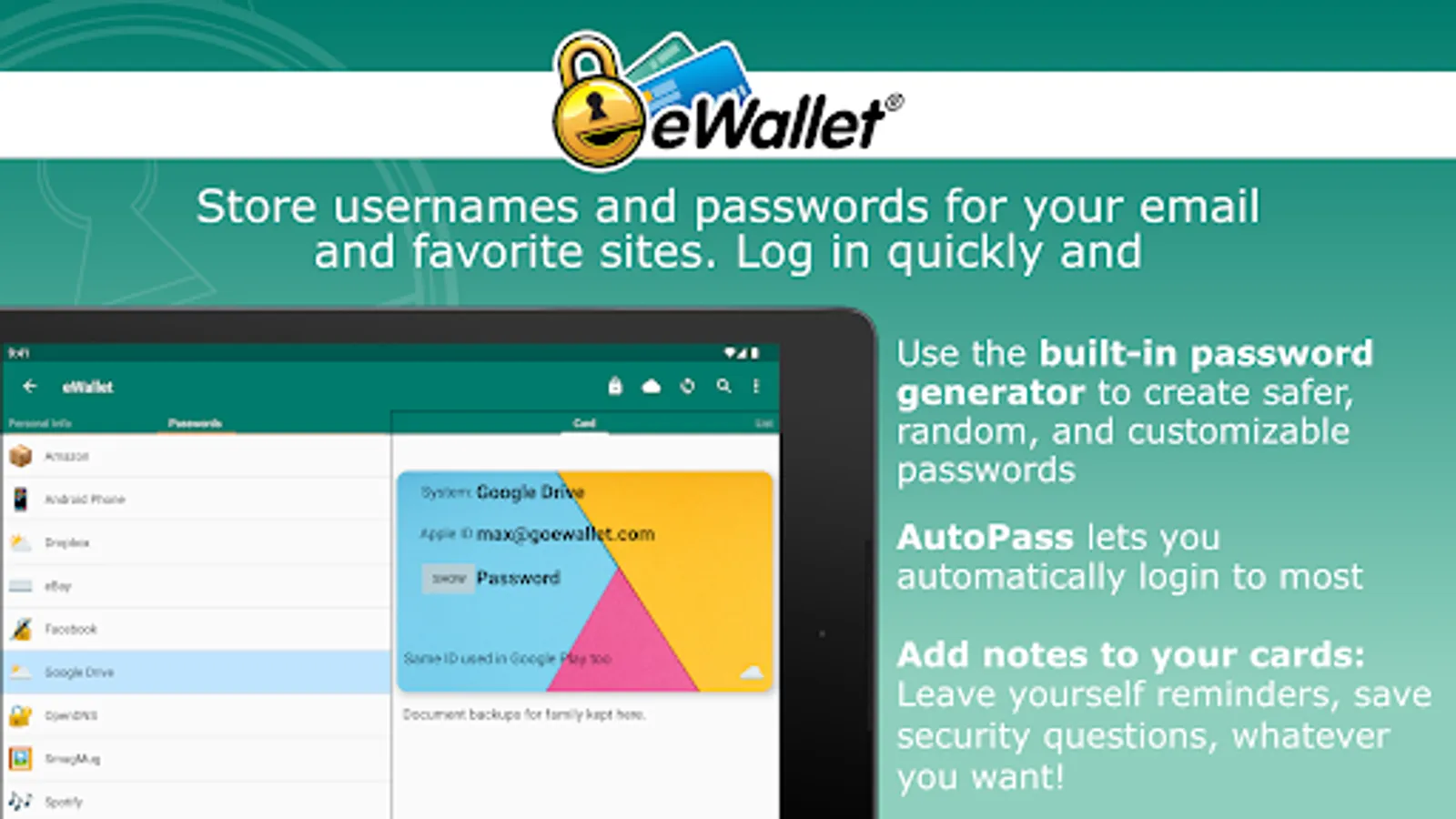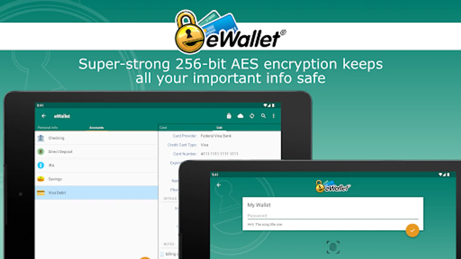 Lock your passwords, credit cards and bank account numbers behind military-grade encryption and carry them with you wherever you go by installing the most sophisticated and easy-to-use password manager app on your Android smartphone and tablet. Stay safe, stay strong, stay smart and organized with the powerful smartphone and tablet app, eWallet®.