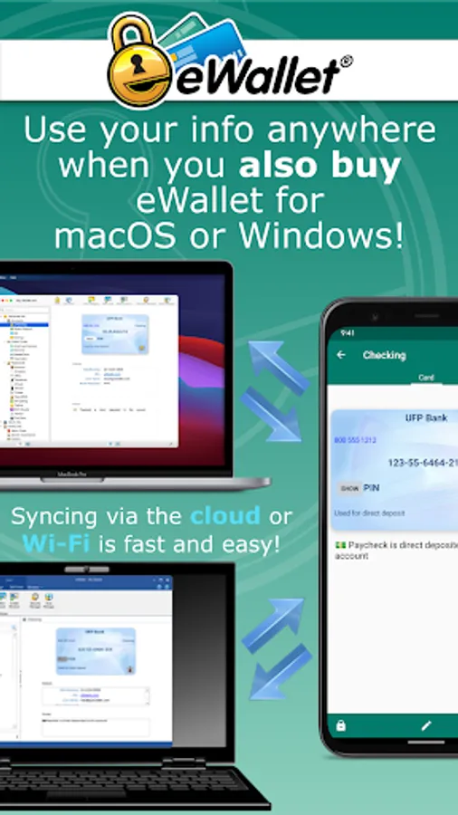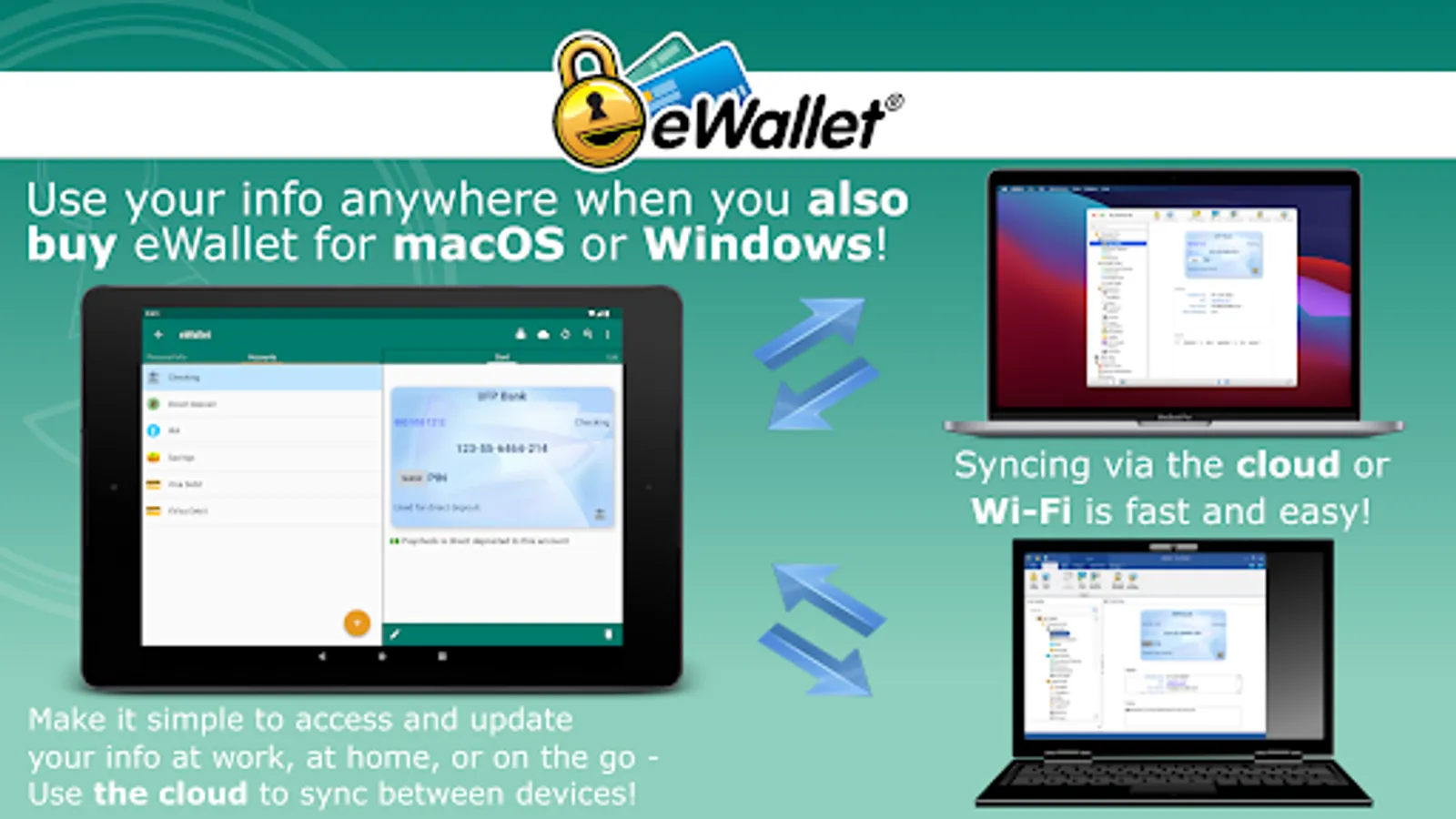 * Sync your data seamlessly over the cloud (Dropbox, Google Drive, or Microsoft OneDrive) or via Wi-Fi with eWallet’s macOS or Windows versions (purchased separately)
