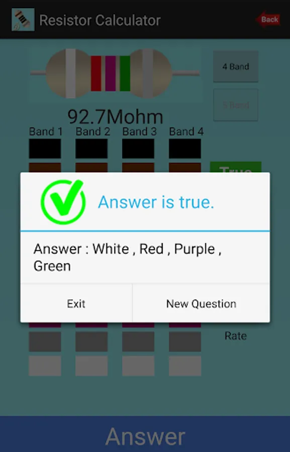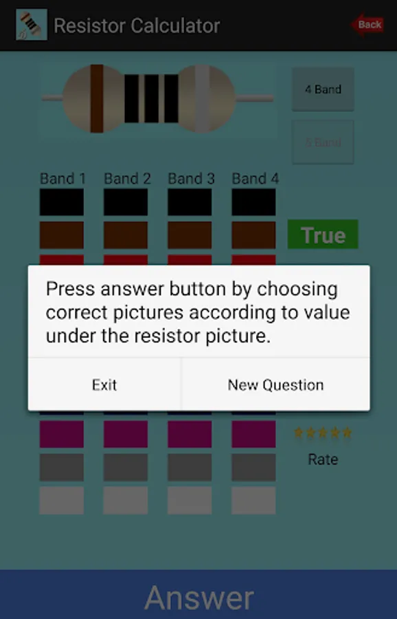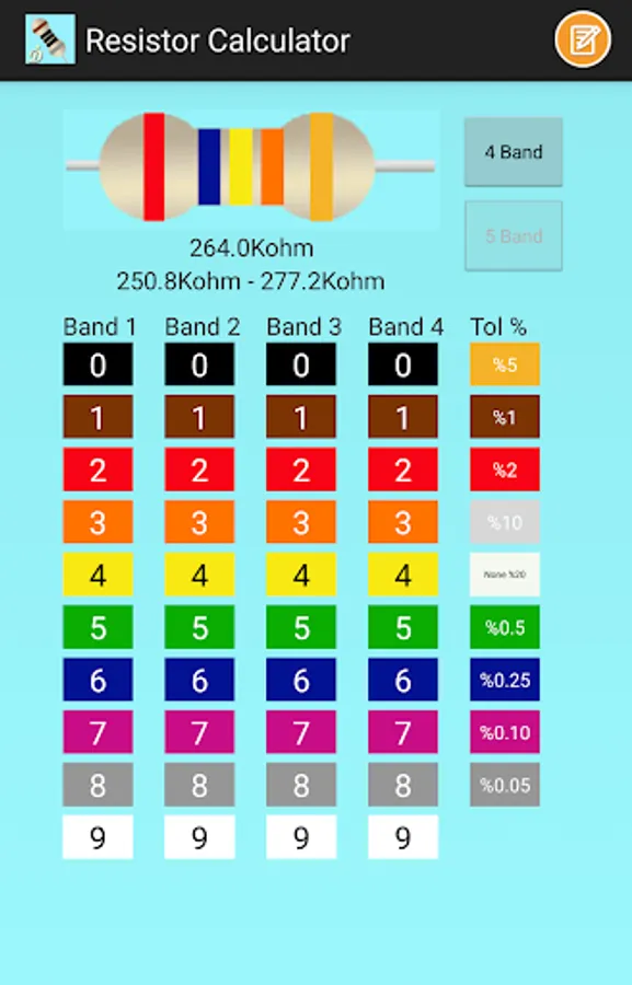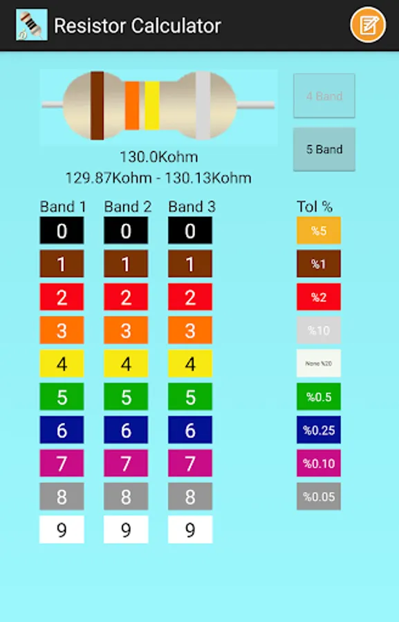 Resistor Calculator is an application that calculates the resistance value by selecting the color codes on the resistor. The value of resistance will change after you have made your choice of color values for each color band. You can see the changing colors of the applications contained in resistance. If you specify a color for tolerance, resistor selection range is shown. The application is designed to be of practical use. You can choose your resistor color code with 4 Band and 5 Band options.