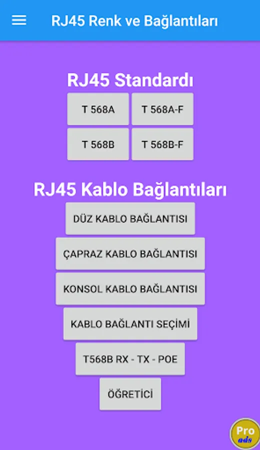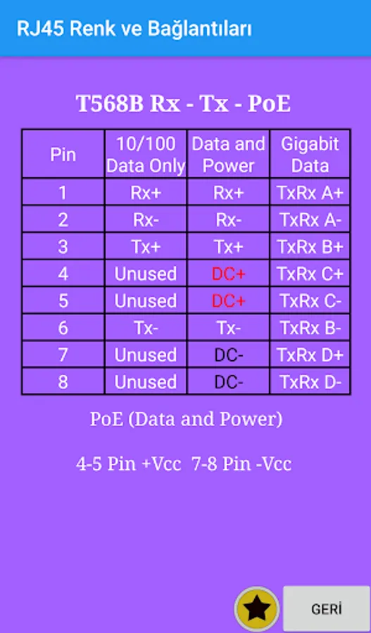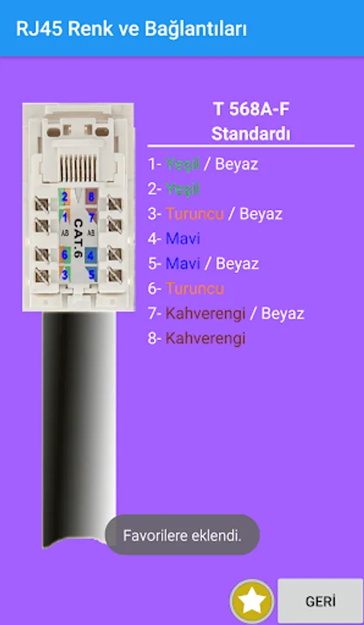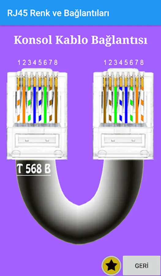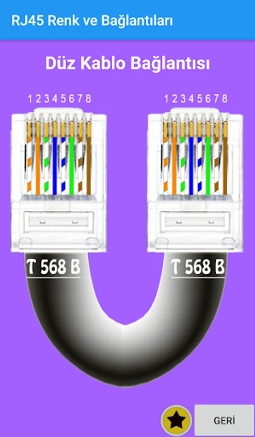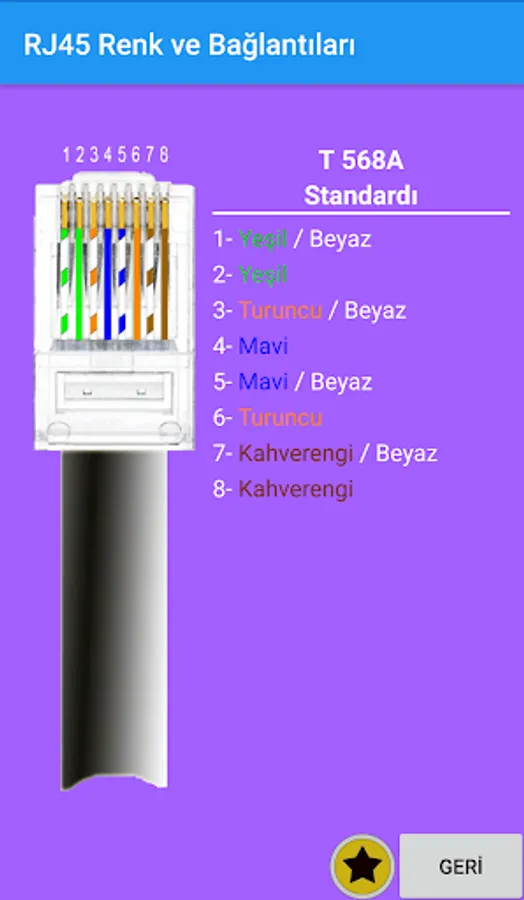 RJ45 is a type of connector commonly used for Ethernet Networking(UTP Cable - Cat5, Cat6). Since Ethernet cables have an RJ45 connector on each end, Ethernet cables are sometimes also called RJ45 cables. Each RJ45 connector has eight pins. RJ45 cables can be wired with T568A standart and T568B standart. You will learn this standarts with this application.