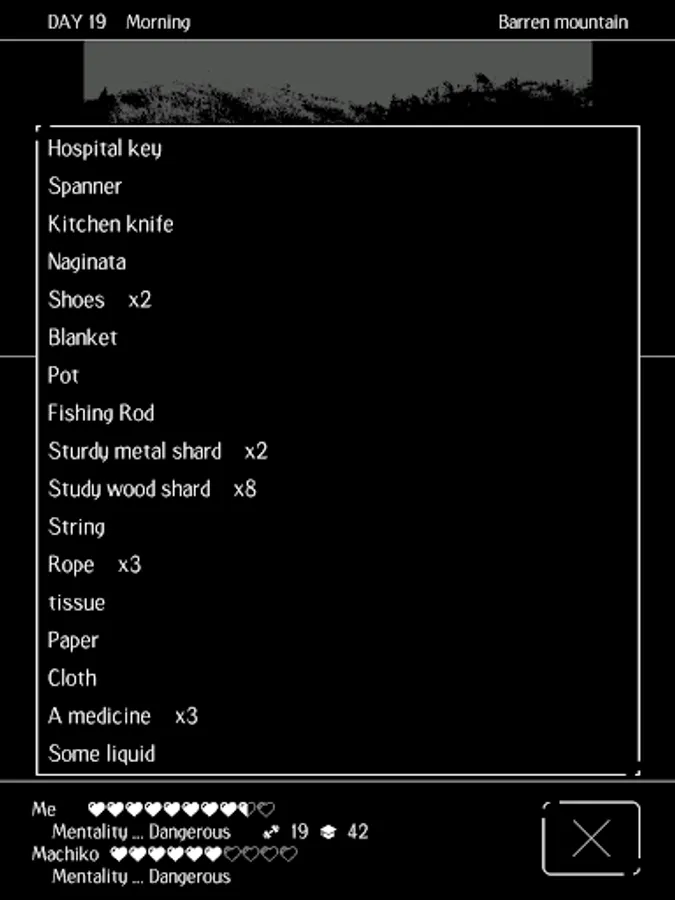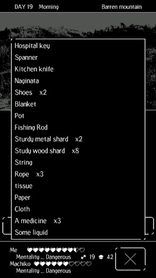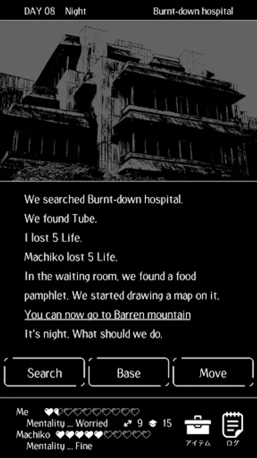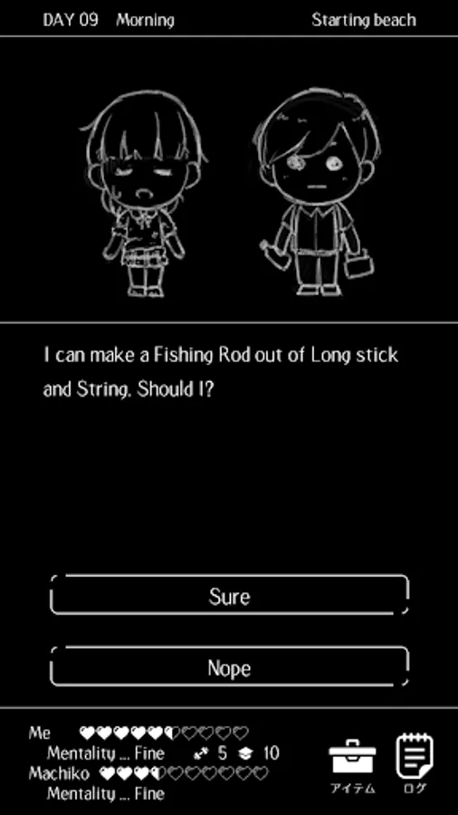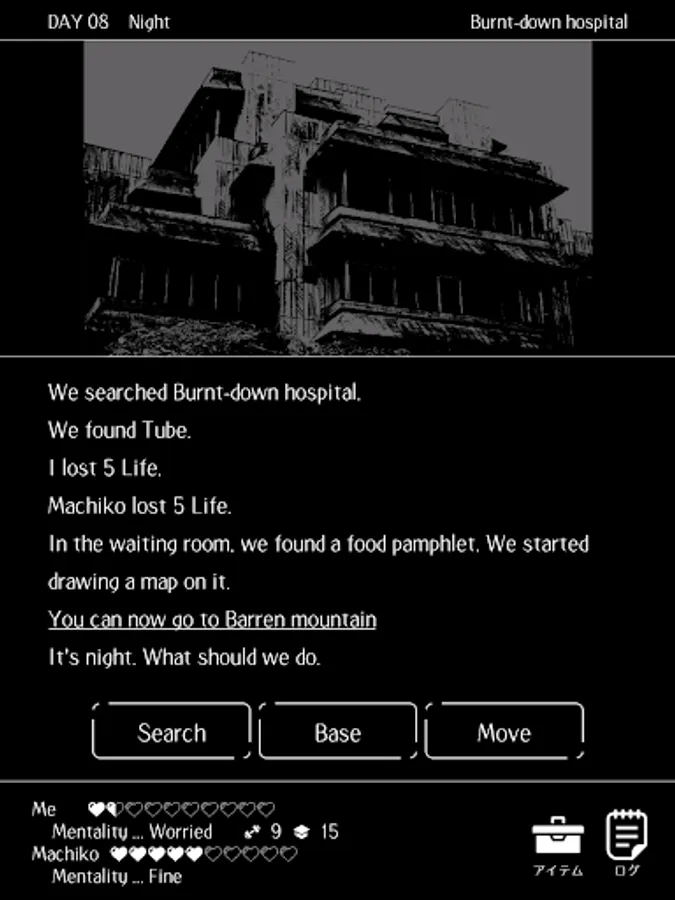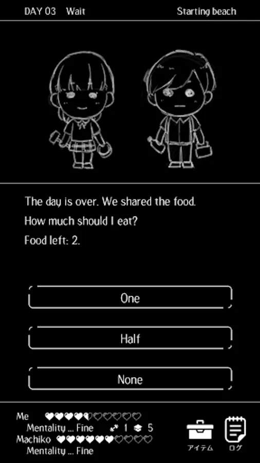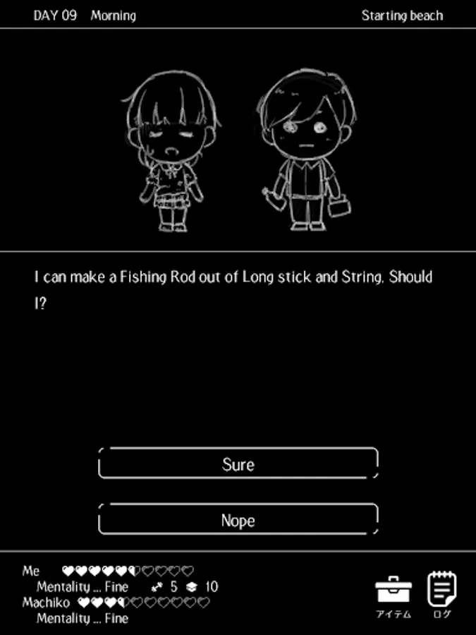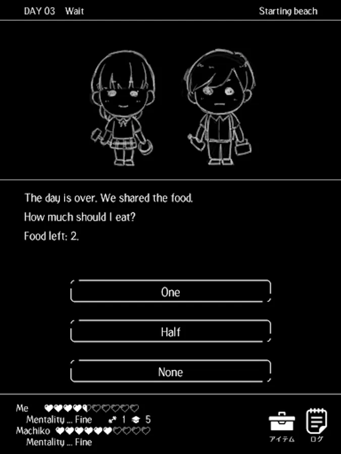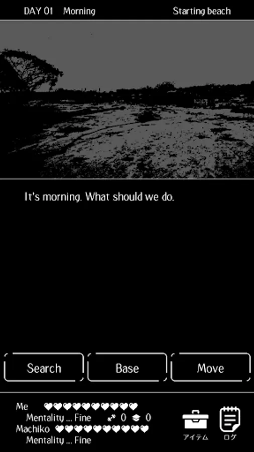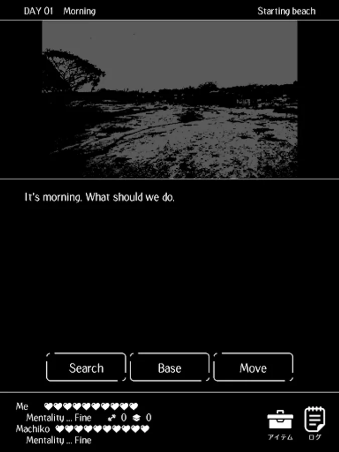 Explore your surroundings, find food and materials and establish a base of operation. Events will randomly occur that may help you or cause you to suffer.