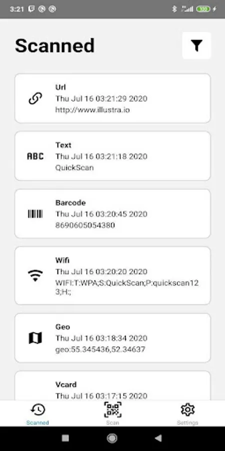 The application saves the data after the barcode or QR code is read, so that you can always go back and see the result if necessary.