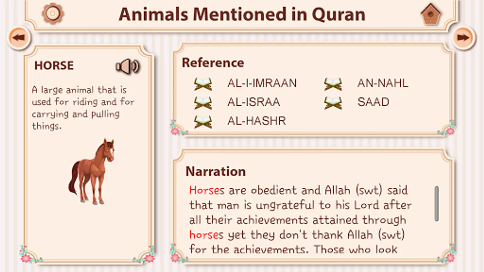 We have tried to compile information about all the animals that have been directly named or have been referenced in the Holy Quran. This app will help children to know about the animals and their significance in the Holy Quran.