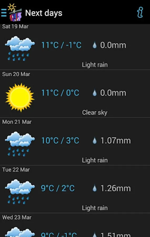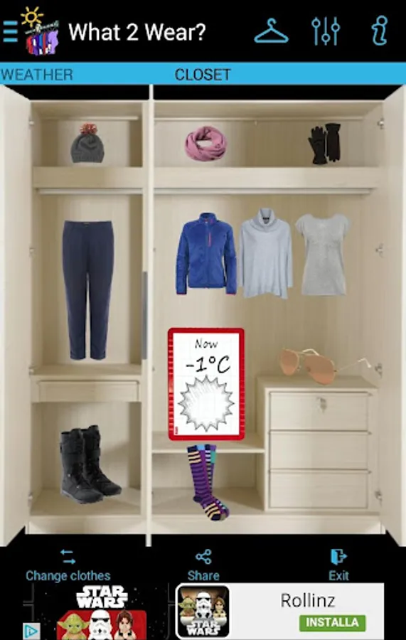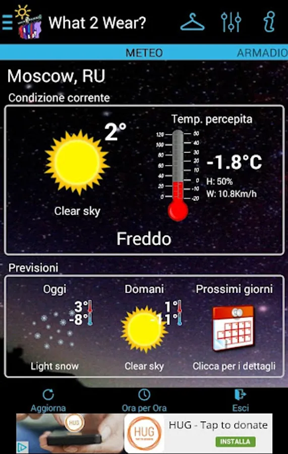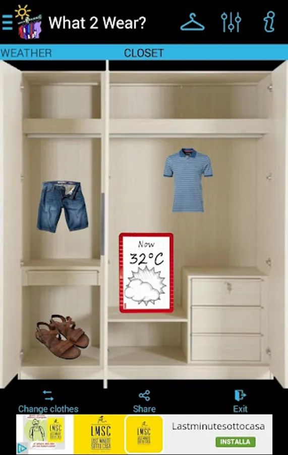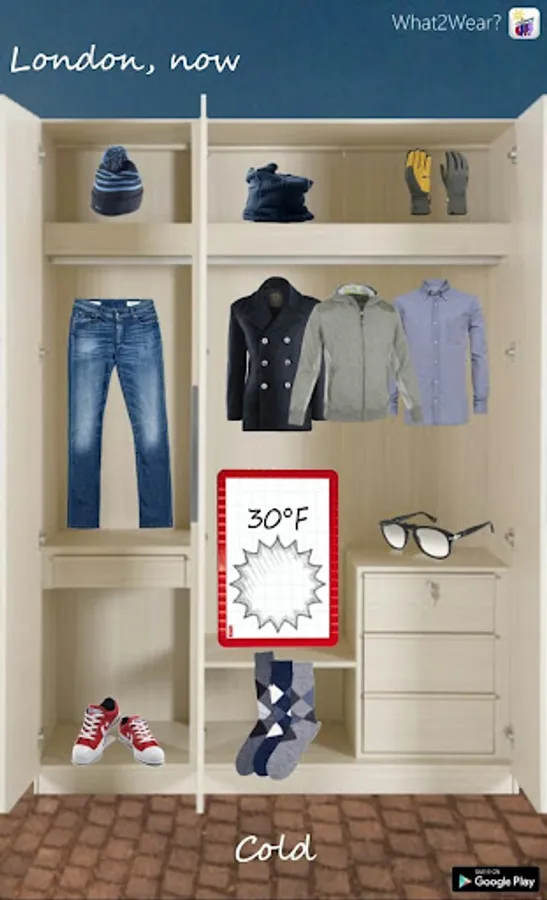 It downloads in real time weather information for your city and calculates human body heat index according to humidity, temperature and wind suggesting the appropriate clothes to wear.