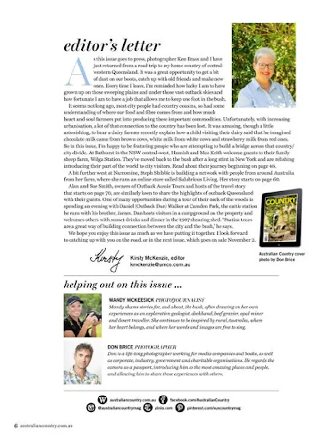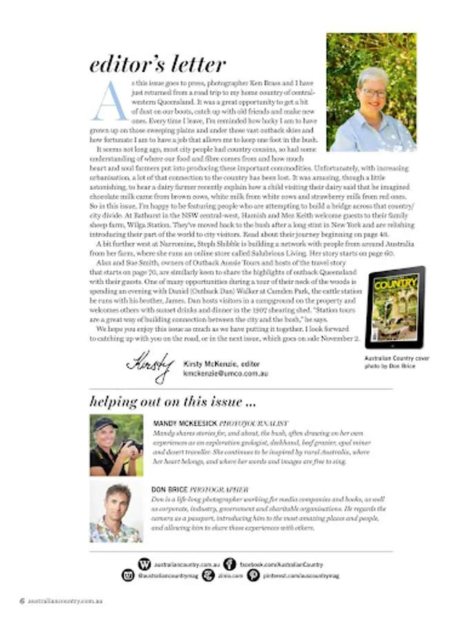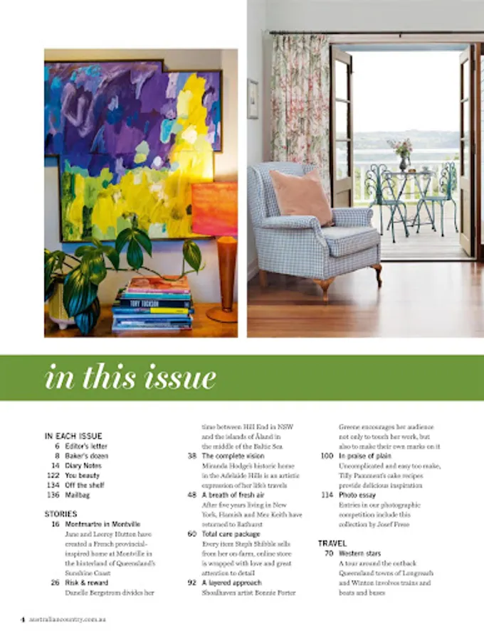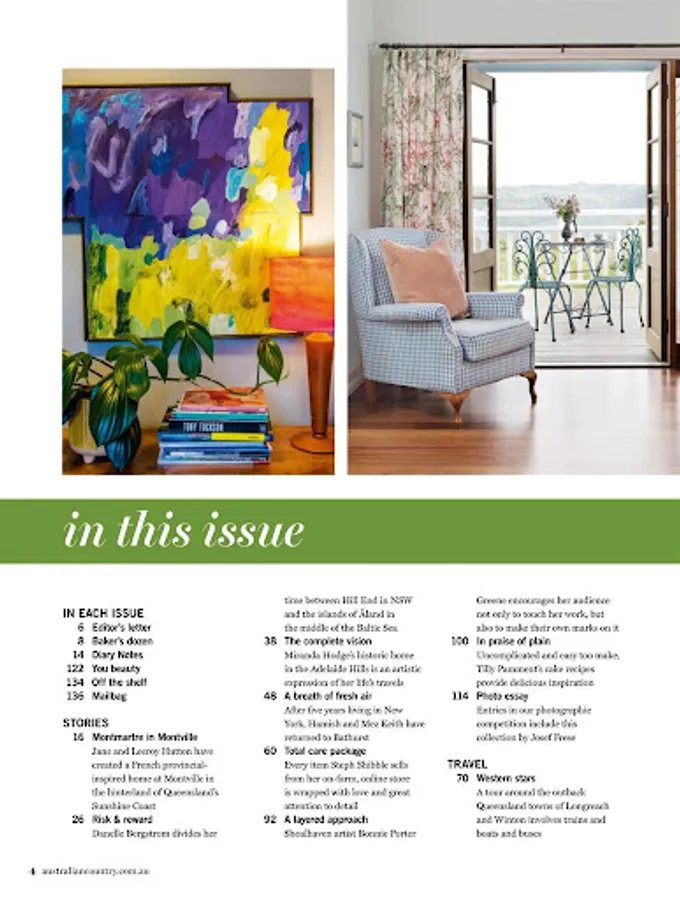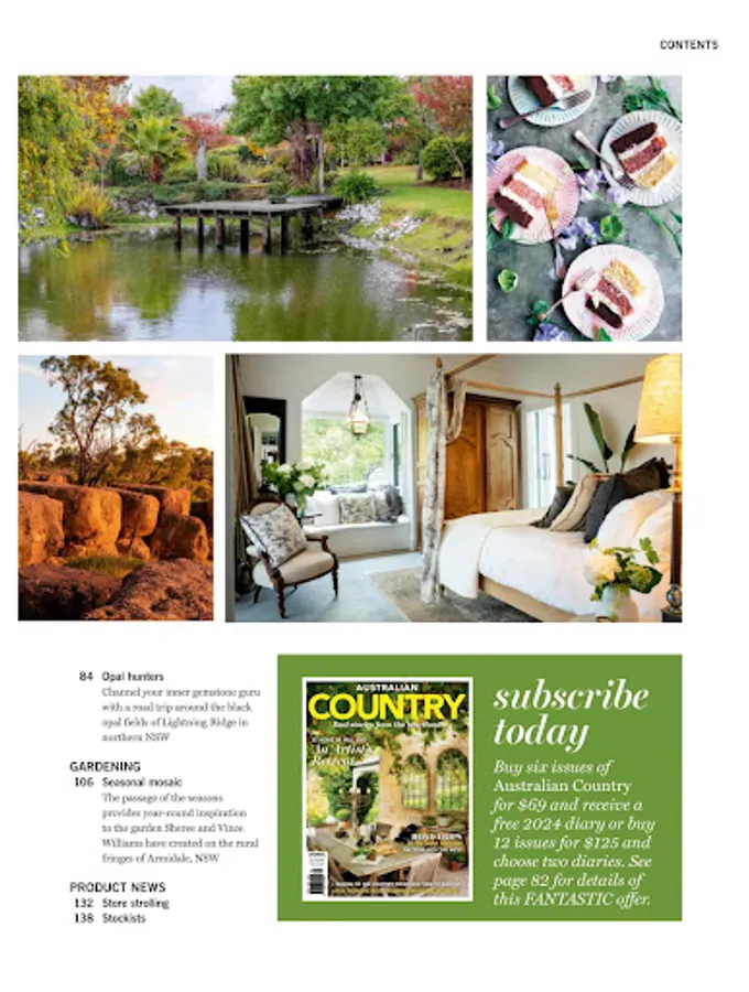 Australian Country is a bi-monthly magazine for the family member who enjoys the finer things in life: making a home for their loved ones, antiques and collectables, looking at sprawling country homesteads and relaxing on the verandah with siblings, children and grandchildren. Our magazine reflects this, with beautiful photographic spreads of home interiors and exteriors and tips on perfecting the interior of your home, including an array of delicious recipes.