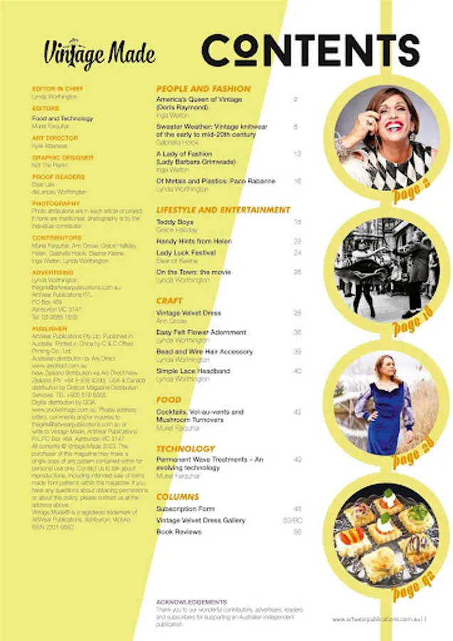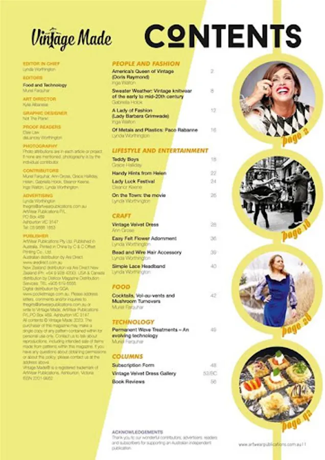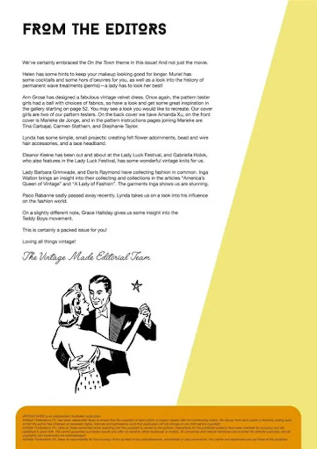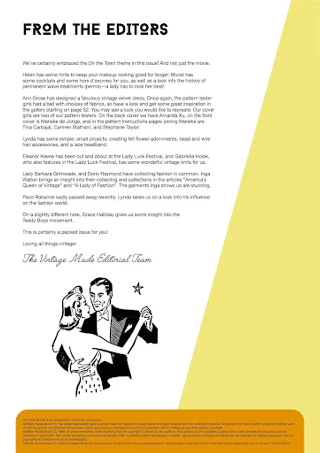 Vintage Made is about the love of 1920 – late 1950 vintage fashion and the return to a simpler way of living. It includes a mix of articles, tutorials, nostalgia, profiles, cosmetic and/or hairstyling tips, stunning Gallery shots and information on how to identify true vintage. Issue 1 for example, profiles Dita Von Teese, has a step by step 1950’s hairstyle tutorial, looks at the history of handbags and underwear, explains what style of hat goes with a certain face shape and takes a look at the Golden Era of costume jewellery. The mix includes 4 regular columns, around 10 feature articles, 3 tutorials and a Calendar of Australian Events. The first issue contains an overview of the 1920’s to 1950’s. All following issues will have a slightly different theme, looking at each era in more depth. Join us on an ongoing journey through time, looking at the fashion of the decade and the moments in history that helped shape that decade. You will learn how to date clothing and accessories to a particular time period, with stunning photography and well researched information. It is all about the shared love of vintage and the evocative emotions that living vintage elicits…