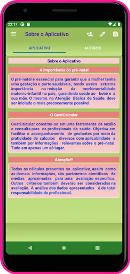 GestCalcular is an aid and consultation tool for health professionals. It aims to facilitate the monitoring of pregnant women through the practicality of various calculations with applicability and also by relevant information about prenatal care. All in one place.