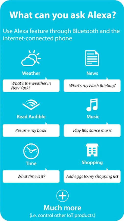 After opening Aud Click 2 app, simply click top ring and ask Alexa with your voice to answer questions, update news and add products to your shopping list. Using the Aud Click 2, you can also play music, generate weather reports, and a lot more. The Aud Click 2 works with all major services and stations, including but not limited to: amazon music, tunein, iHeartRadio, and more. When you have an incoming call, you can talk hands free conveniently. If you have other Alexa compatible smart devices such as bulb, plug, or thermostat, you can control them with your voice through Aud Click 2 too.