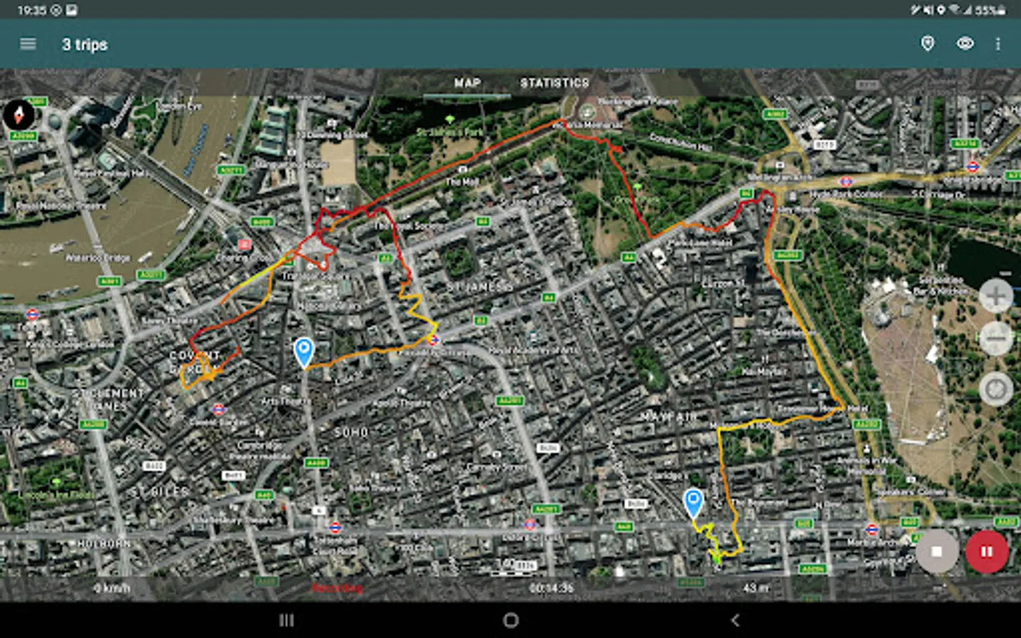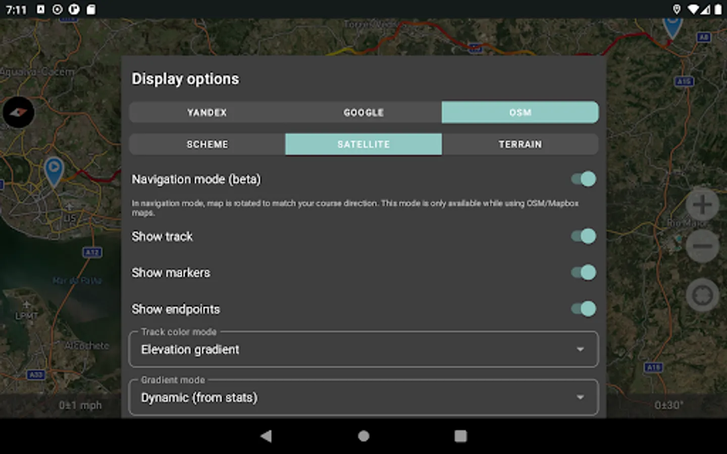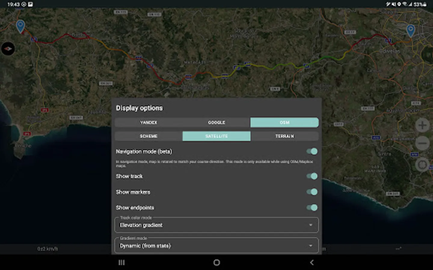 You can view the tracks and the surrounding area in the application using scheme from OSM, Google or Yandex, as well as satellite images from Google or Mapbox - this way you will always have the most detailed map of the area anywhere worldwide. The map areas you view are saved to your phone and remain available offline for a while (this works best for OSM maps and Mapbox's satellite images). To record and calculate track's statistics only a gps signal is needed - Internet is only required to download map images.