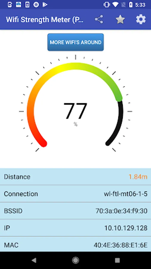 - WiFi Details: Gain insight into your WiFi network with valuable information such as distance, connection name, BSSID, IP, MAC address, link speed, and frequency.