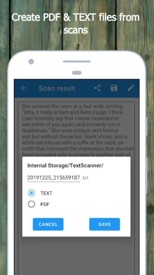 ◼ Convert scanning results to PDF or TEXT simply and accurately in seconds: Create PDF and TEXT files from photos and documents.