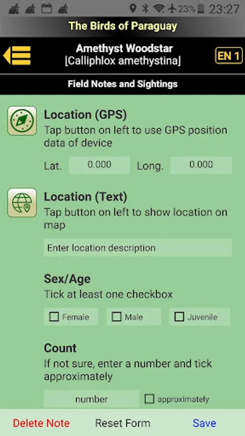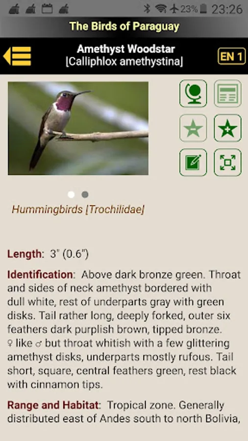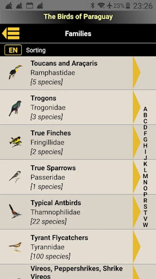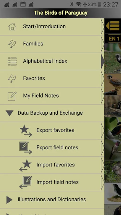 As with The Birds of South America, which contains more than 3,000 birds found on the entire continent, also The Birds of Paraguay runs on Android devices and can exchange Field Notes and Favorites lists between identical app versions on devices of other users by exchanging export files.