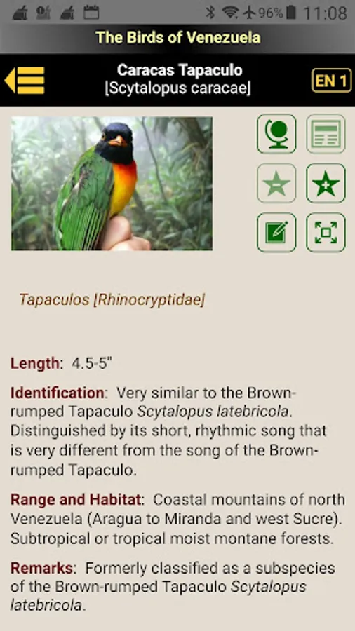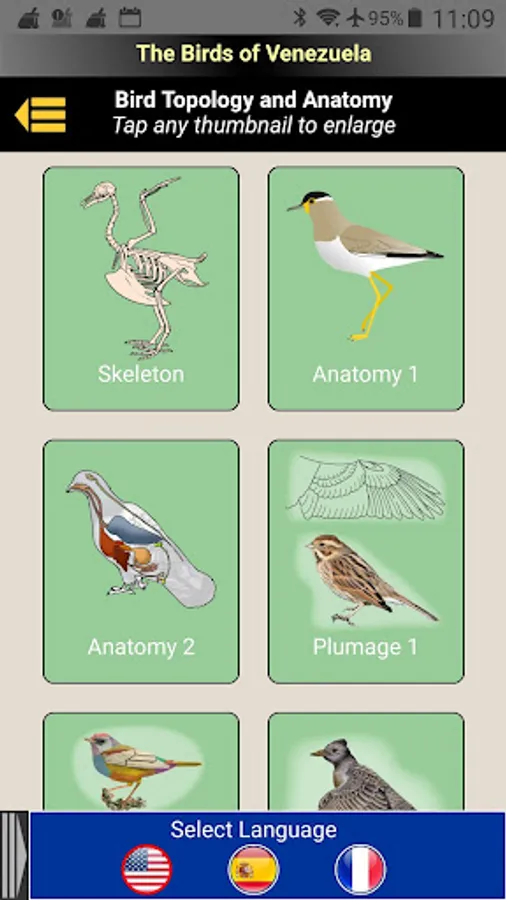 The current app version contains the descriptions and images of 1,369 bird species found in Venezuela. Moreover, an ornithological dictionary (English, French, Spanish, Portuguese) and detailed illustrations and drawings of bird anatomy are included.