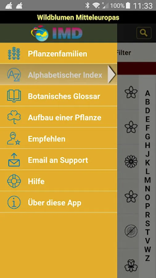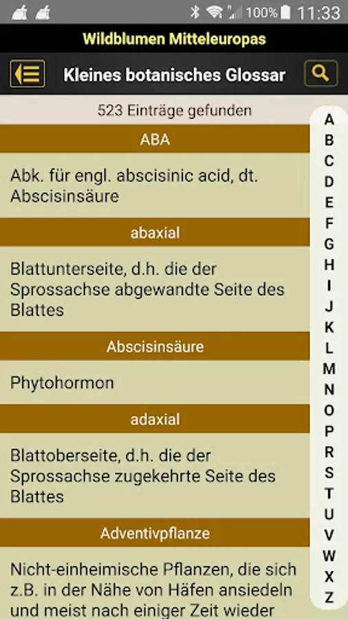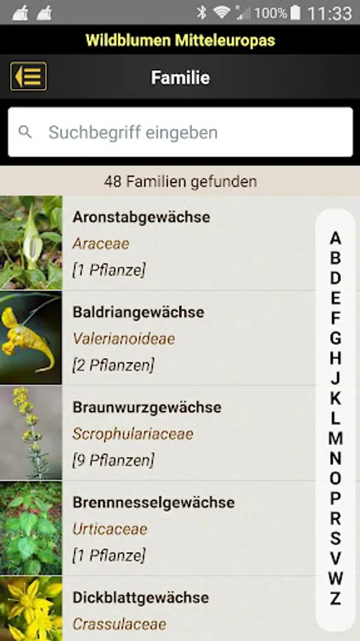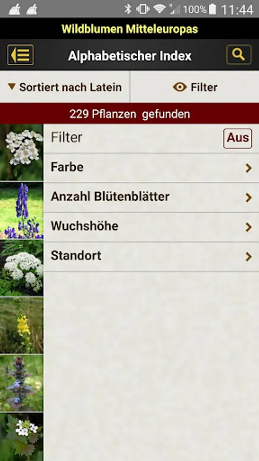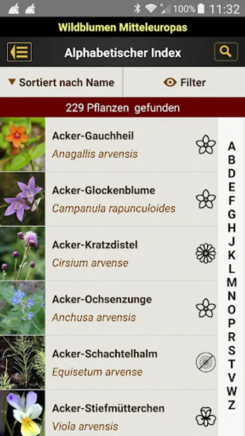 - Alphabetical search using the flower name (German name, botanical system, alternative names) or full text search in the description