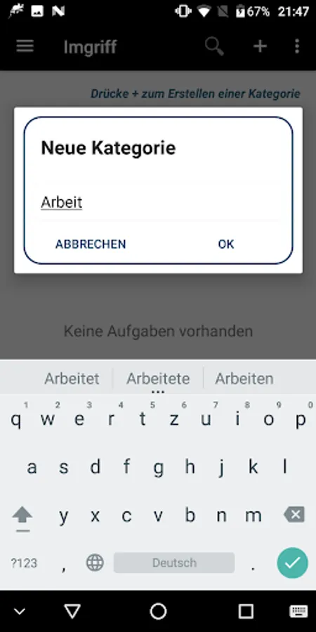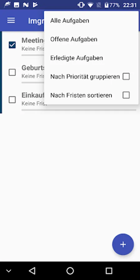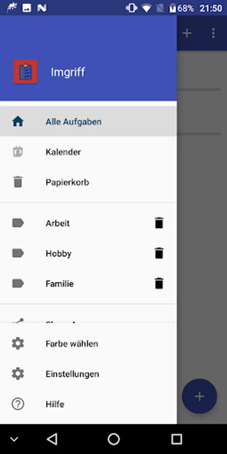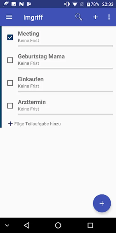 With Imgriff you can easily organize your appointments, to-do lists, check-off lists, to-do lists and deadlines. You create categories in which you can place tasks. For upcoming deadlines or appointments you will receive a convenient notification. You can divide a task into subtasks. The more subtasks are done, the higher the progress of the overall task.