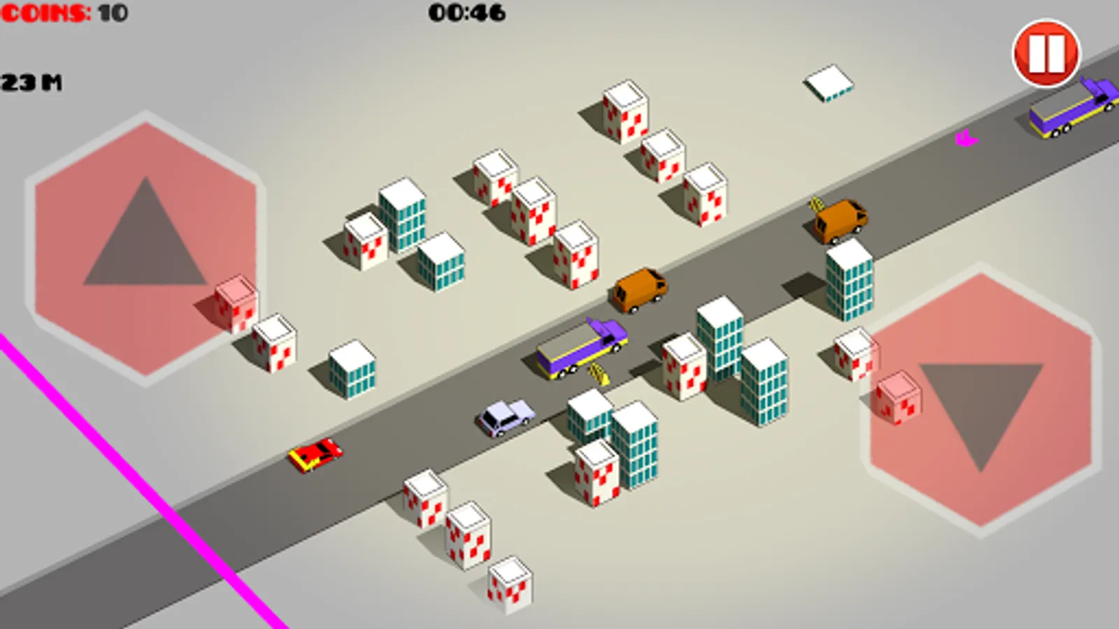 Put your driver skills to the test in this 3D racing game for Android. Press the "up" button to move the car to an upper/farther lane, press "down" to move to the lower/closer lane. Pick coins and ">>" speed boosts. Avoid other cars, barriers and "<<" slowdowns.