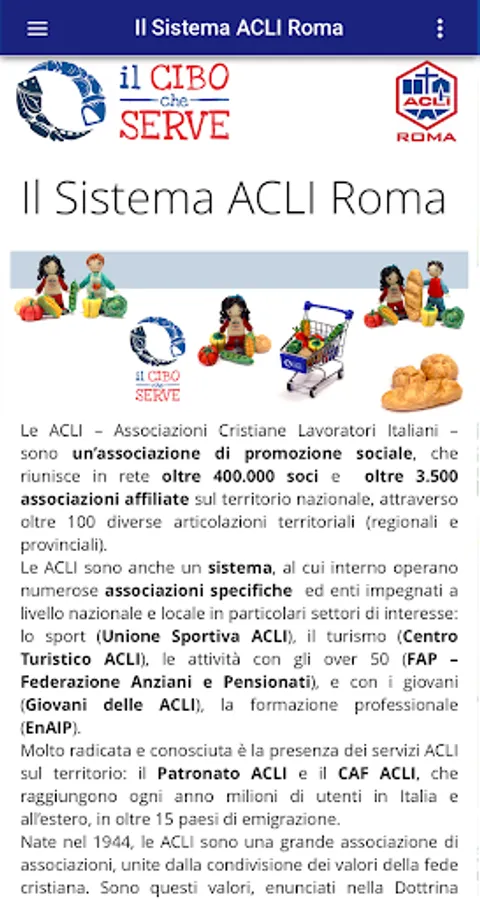 The food you need is a project to fight waste and fight poverty in the city of Rome, which acts through the recovery and redistribution of fresh food and bread to be expired soon. The project, conceived and promoted by the ACLI of Rome in the framework of the call for the fight against extreme poverty and social marginalization, further develops the consolidated experience of the bread A Chi Serve 2.0 which recovers the unsold bread and makes it available to all bodies involved in fighting poverty. The App Romacheserve, is the innovative element of the project, a tool for mobile devices of orientation for vulnerable people and an incentive for the collection and redistribution of food products.