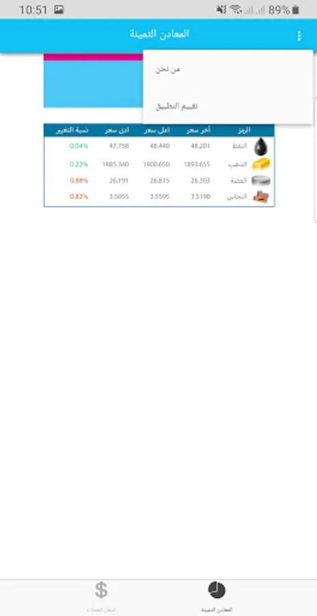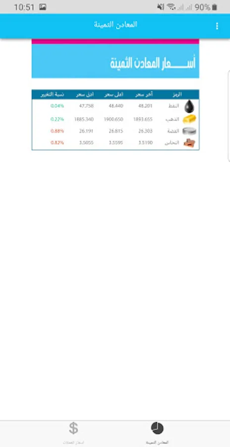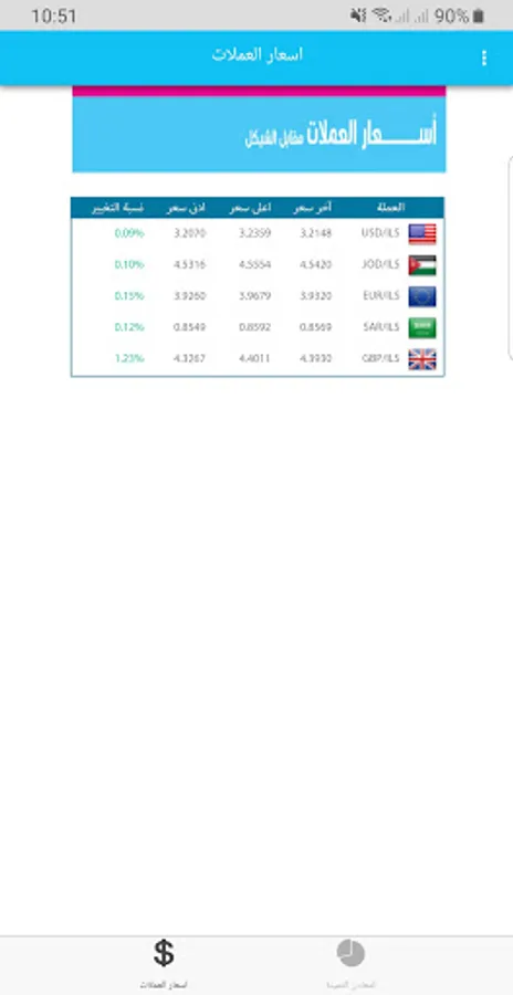 The application displays the prices of currencies and basic metals in Palestine with the shekel