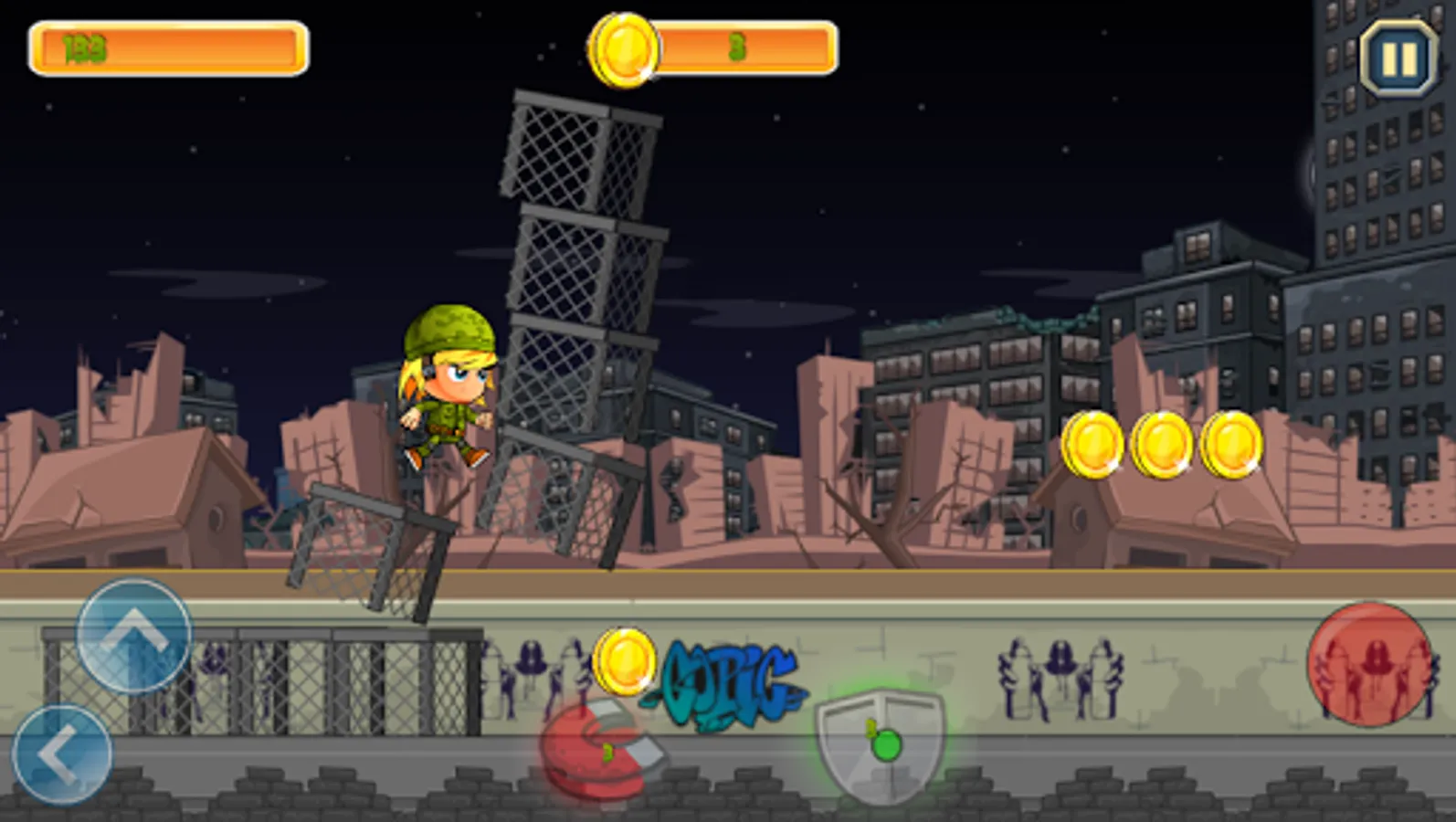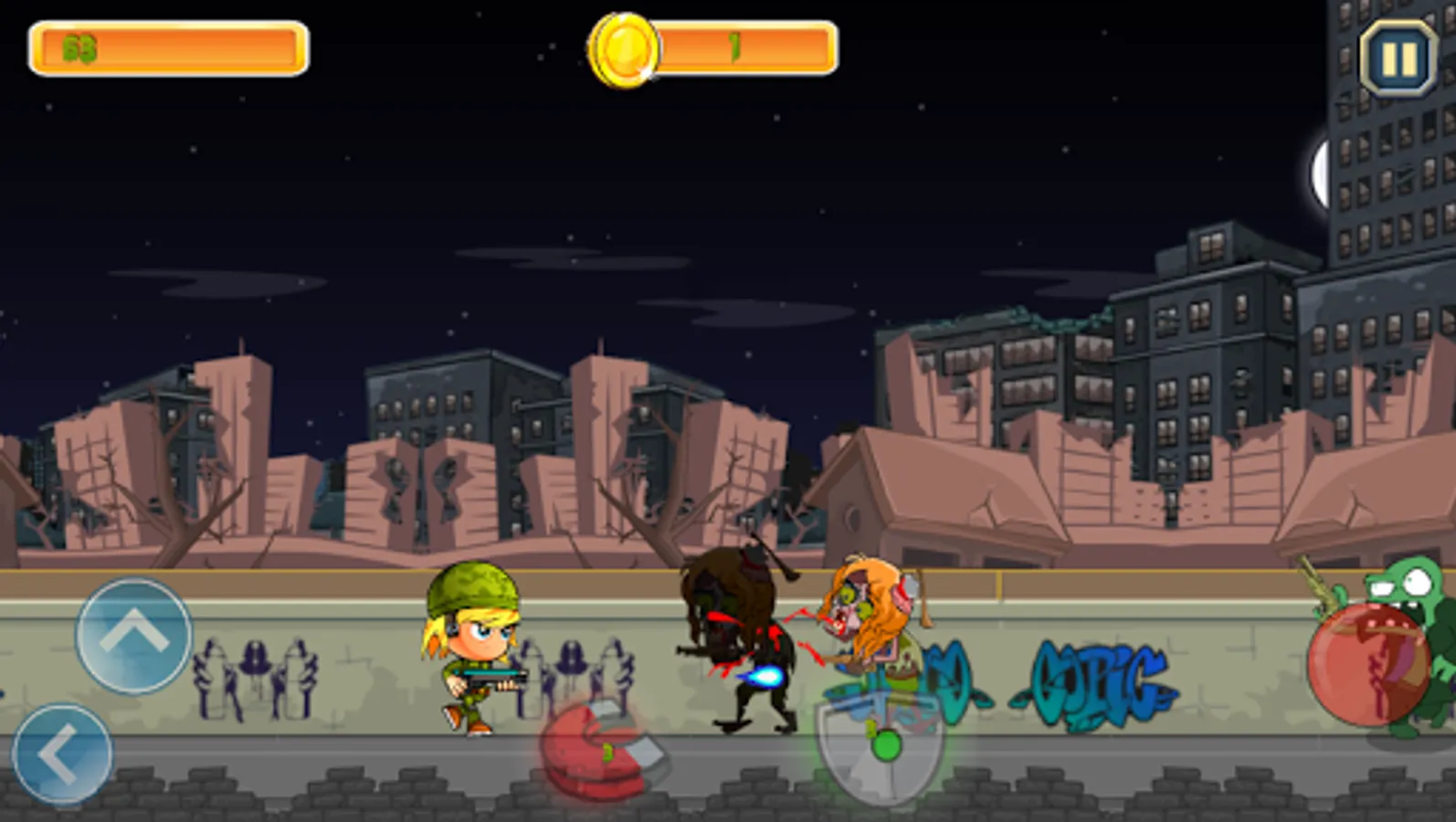 This is a simple to play but very addictive platform game. With great graphics and a mesmerizing soundtrack, this is one game you will not be able to put down. Shoot the zombies and collect the coins. Pick up magnets and use them to grab coins that are just out of your reach. Pick up shields to guard against the zombies. Collect enough coins to gain multiple rewards.