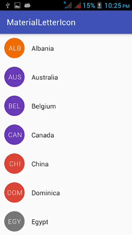 Material Icon application demonstrates the letter of name in view and display image as in Gmail application.