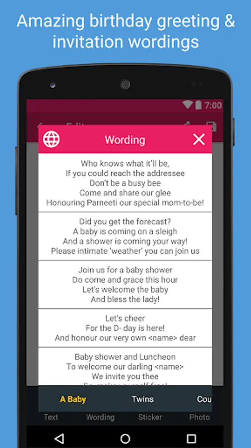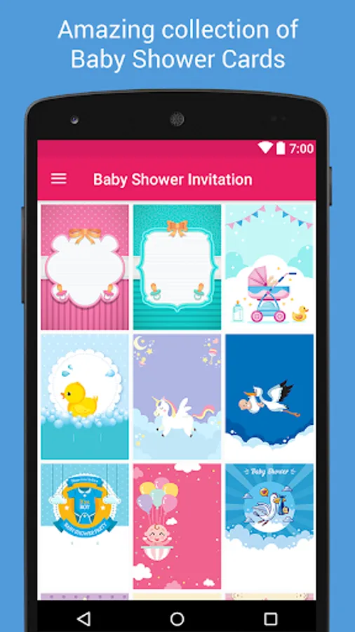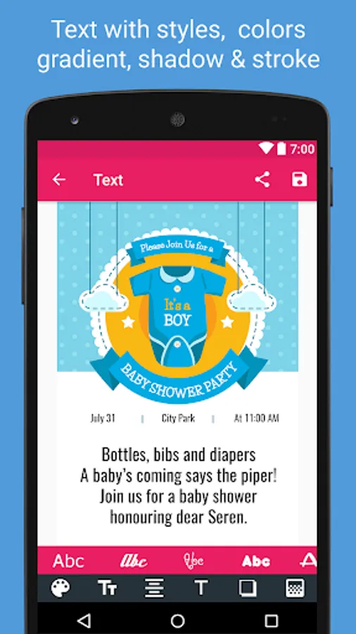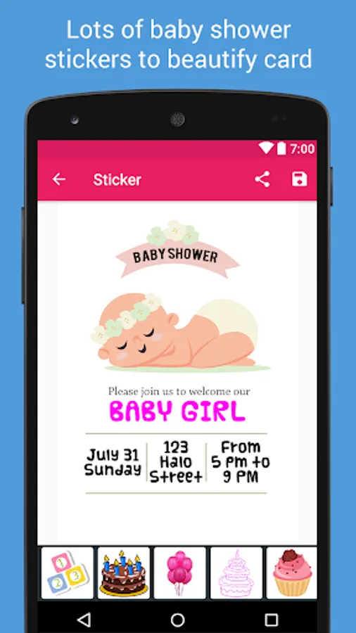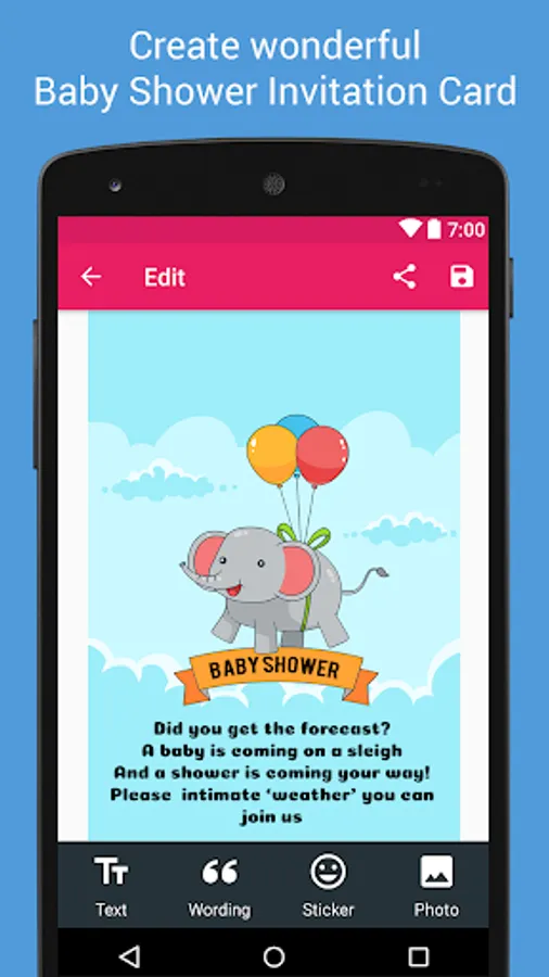 Invite all your family relatives and friends to the showering of the baby. Use this app to create some amazing cards to invite all the close ones into the baby showering day. Select any of your favorite card from lot of different beautiful options of card selection. Use variety of different editing features to make it look more attractive and beautiful.