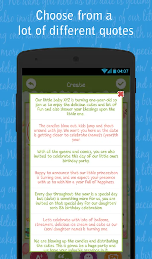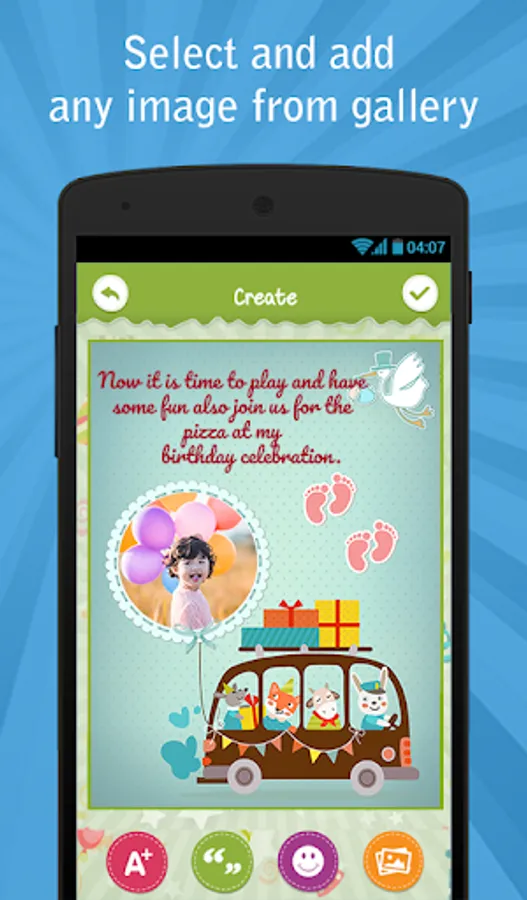 The birthdays are the most awaited day of the year for anyone especially for small kids who would be very excited for all the gifts and the cake that they are going to cut during the birthday party celebration. Birthday party invitation would be a perfect app for all the party givers to invite their friends and relatives in a totally new way. Select from a whole lot of beautifully designed card collection with different party invitation quotes in it. Select the image of the birthday guy from the gallery and paste it into the card with a birthday quote and then share it to all your friends and invite them to your awesome party.