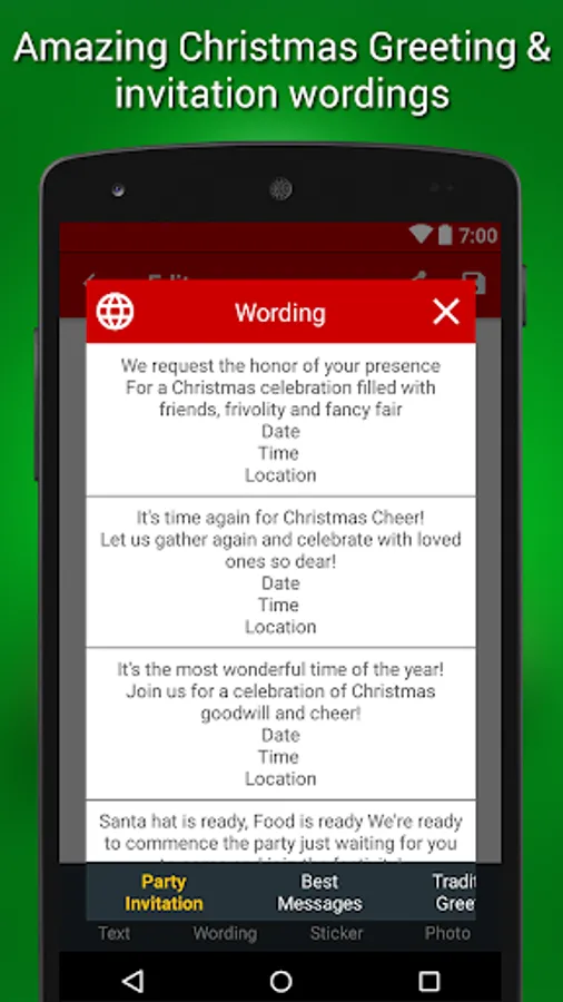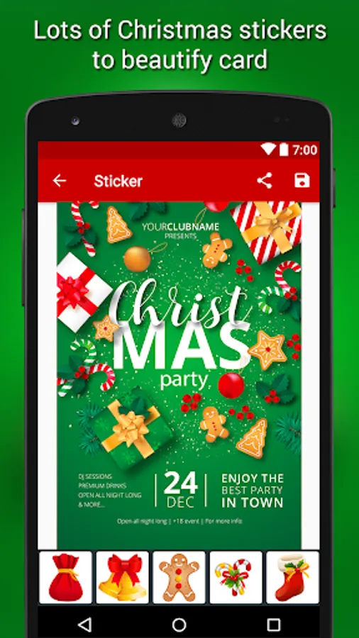 This Christmas party is going to be pretty cool and lot of fun. Get a huge crowd of friends in your Christmas party by inviting them all in a totally new way. Create totally different Christmas special fun cards from lot of different options of card design and Christmas stickers. Choose a invitation quote or add one of your own to it. Add so many other features to it like adding stickers, images from your gallery etc. Finally save the image to your gallery and share it with your friends.