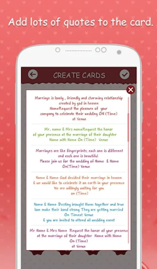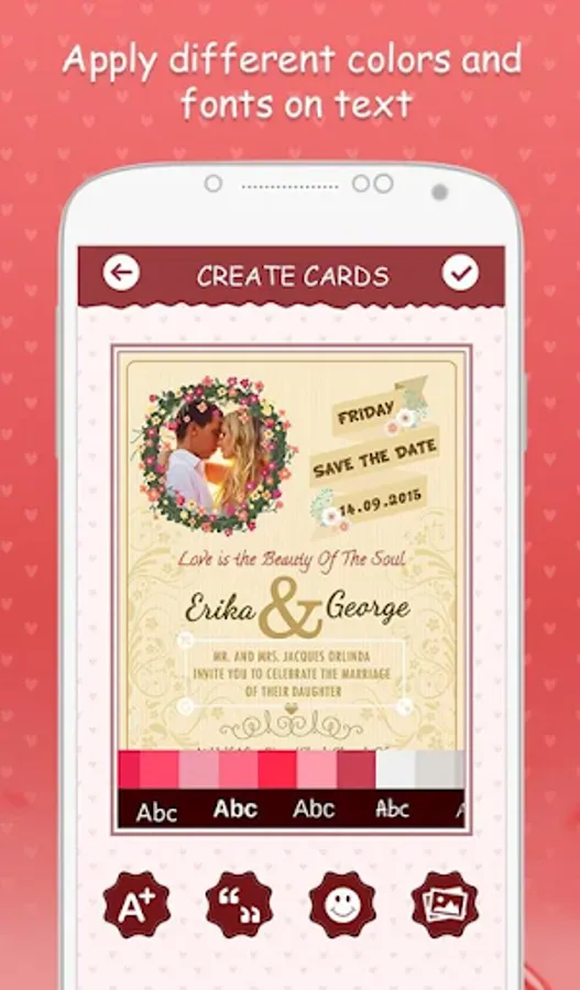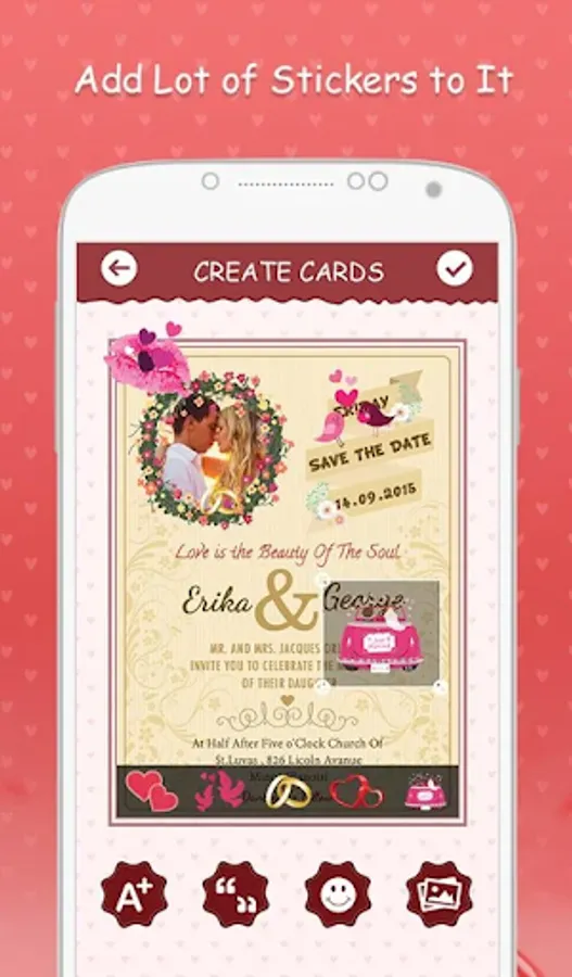 Invite all your family and relatives to the Wedding of your friend, relative or for yourself with this amazing Wedding invitation Card App. Select from a huge number of different beautiful theme and design for the card that you are making. Add lot of stickers and also add an amazing quote in the card. Add any image from your gallery to make it look extra beautiful than before. You can also create your own invitation cards by selecting the design, image, quotes and much more.