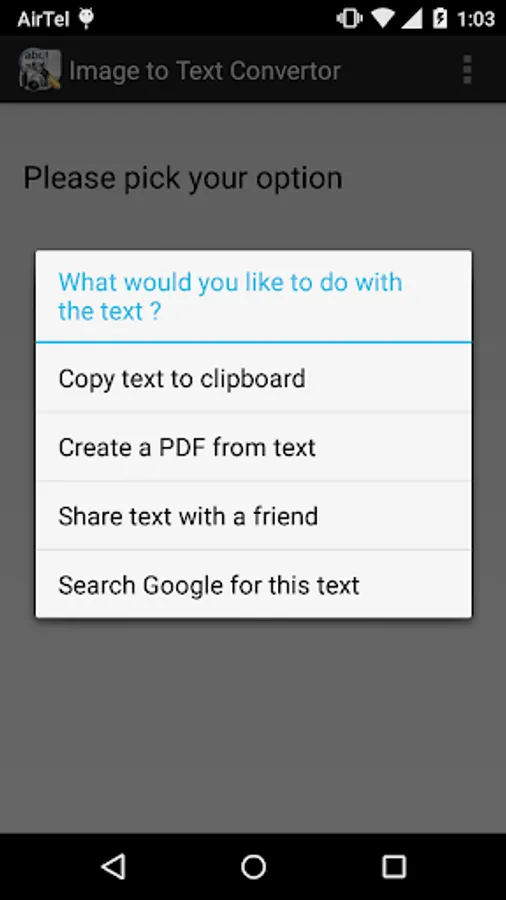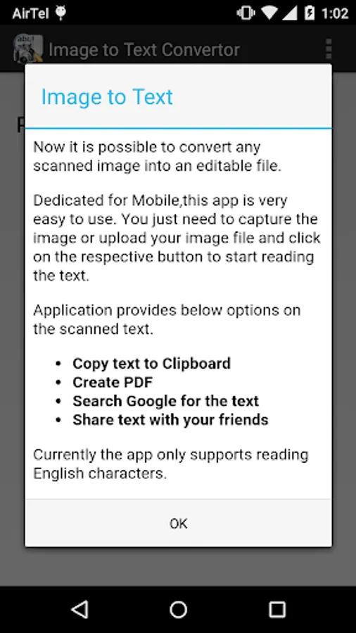 Now it is possible to convert any scanned image into an editable file. Dedicated for Mobile,this app is very easy to use. You just need to capture the image or upload your image file and click on the respective button to start reading the text.