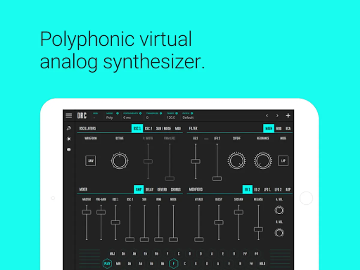 DRC is powerful virtual analog polyphonic synthesizer that recreates the characteristic sound of classic synthesizers like the Roland Jupiter, Yamaha DX7, Moog and many more.