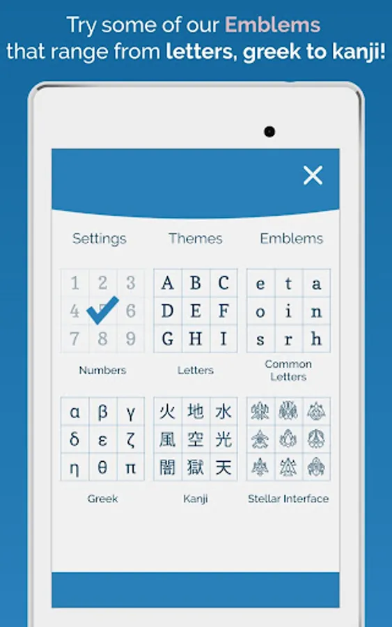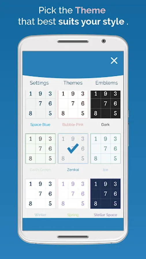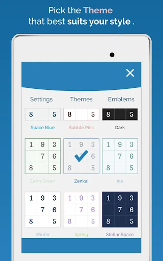 Sudoku Zenkai also features different themes allowing to play on which style you find most comfortable. Tired of numbers? With Sudoku Zenkai emblems you can spice up any Sudoku puzzle with letters, greek, kanji and more.