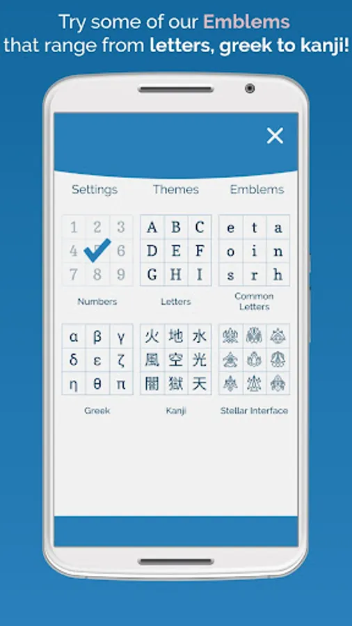 Tired of numbers? Try some of our emblems that range from letters, greek to kanji!