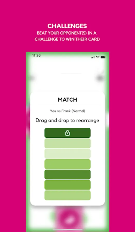 When you spot a match and shake your device, you will enter a challenge. Solve the challenge quicker than your opponent to take their card.