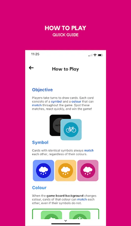 Players take turns to draw cards. Each card consists of a symbol and a colour that can match throughout the game. Spot these matches, react quickly, and win the game!
