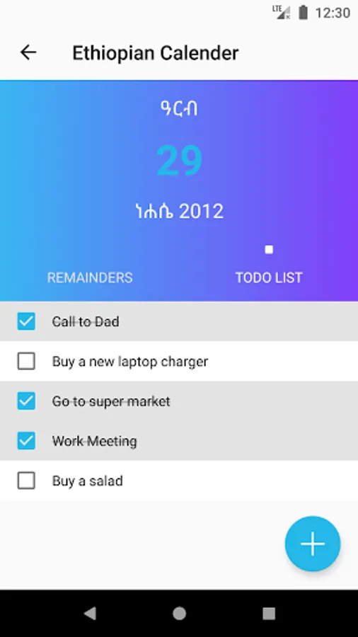 Ethiopian Calendar (Habesha Calendar) app is the best app with many amazing features like:- Date Converter, Remainder & Alarm, Todo-List, Ethiopian calendar widget with a small app size and with the best ui design.