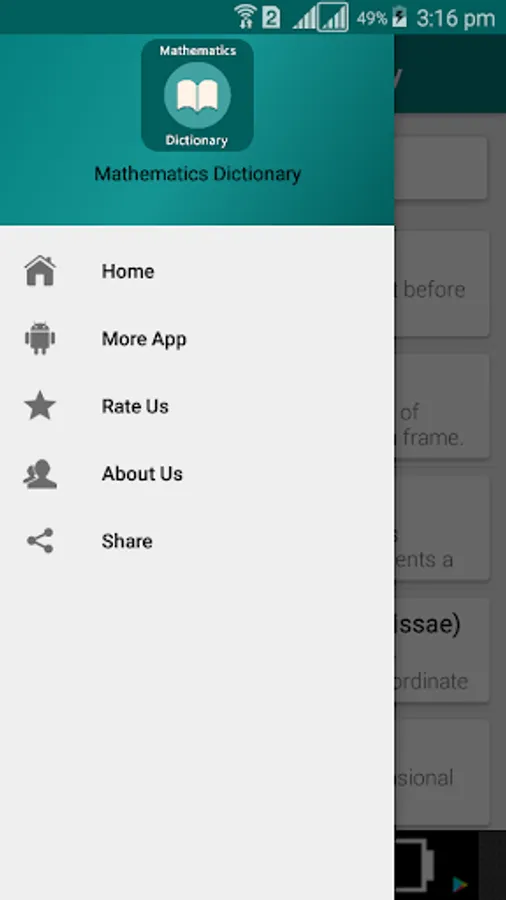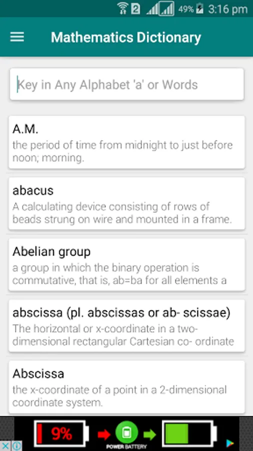 Whether you want to learn Mathematics, this app Mathematics Dictionary should be your perfect choice. This app works offline even without an internet connection. With this app, you can choose to learn a new word everyday using the ‘Word of the Day’ feature. Word of the Day feature in the app tells you a random word to learn each day so that you can learn Mathematics better.