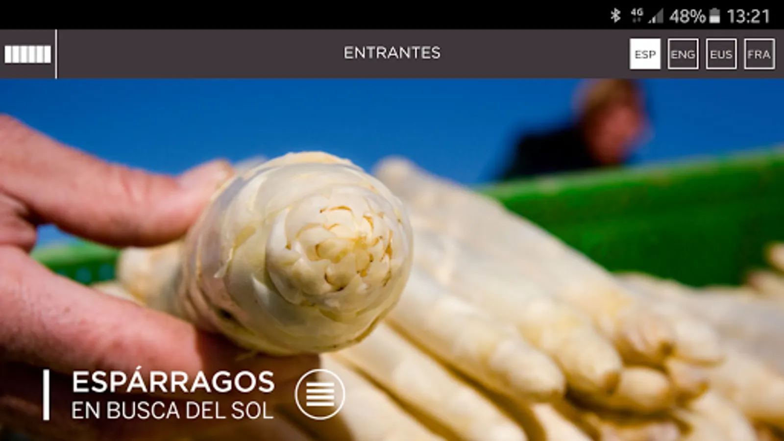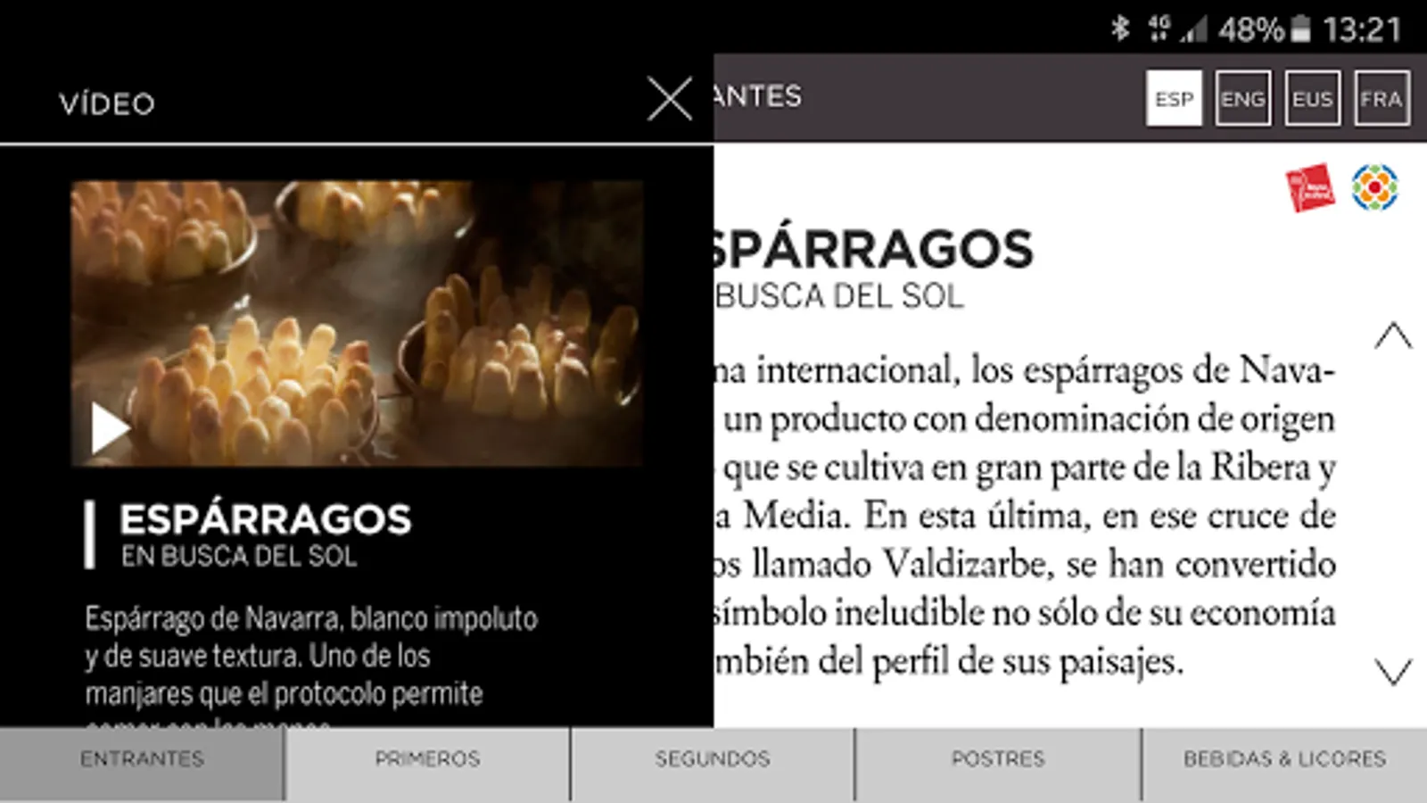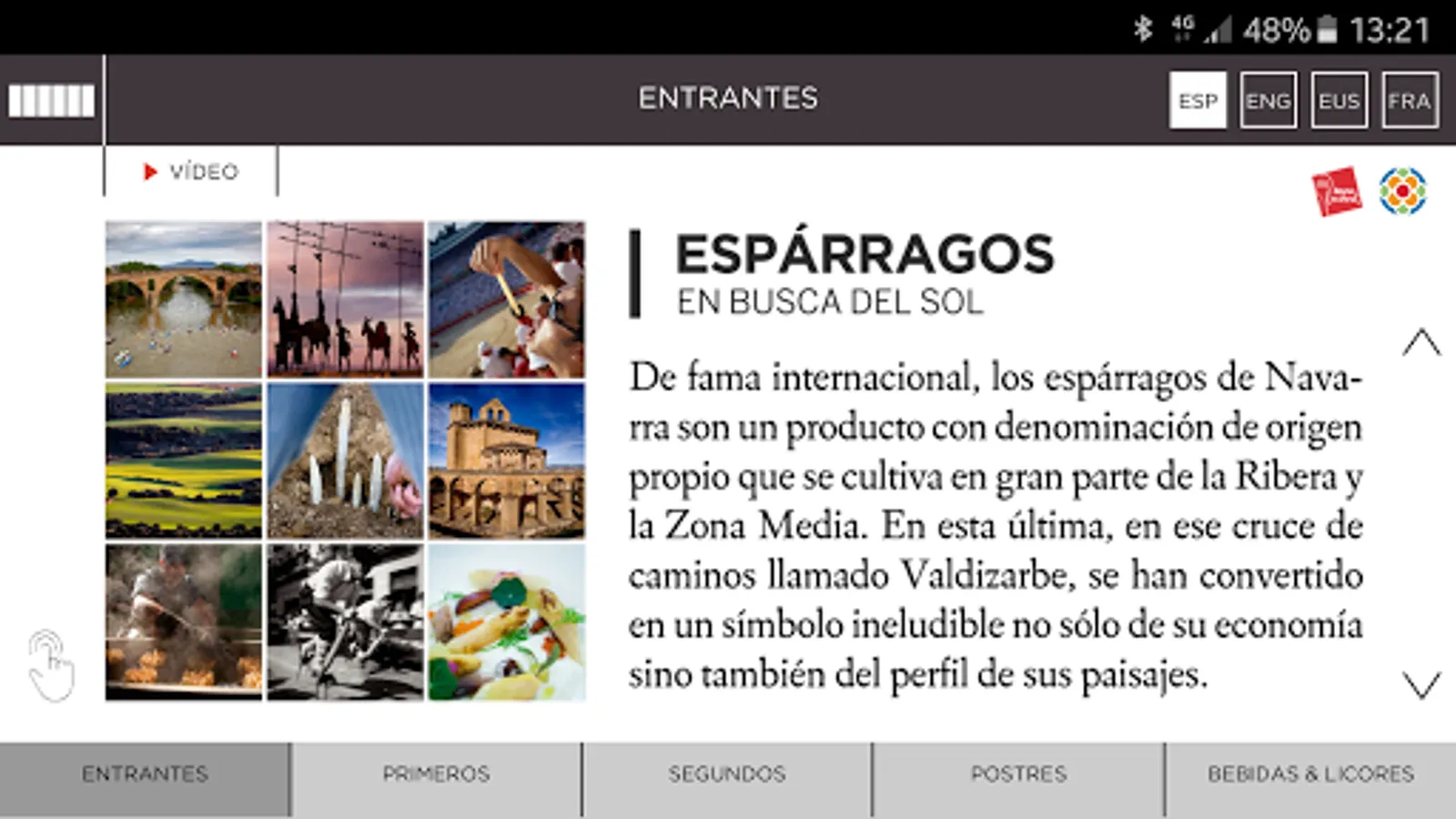 In addition to collecting information from the book, the new App includes new chapters, such as those devoted to cider or meat pony, unpublished photographs and videos of some of the most emblematic Navarran cuisine such as asparagus of Navarra products, piquillo Lodosa, or Pacharán Navarro, among others. Thus, over a photo of an ancient olive tree-index menu appears with five sections: Starters, First, Second, desserts and drinks and spirits. Each is composed of different dishes which in turn invite you to make a tourist trip - Gourmet Navarra to the area where the product is made.
