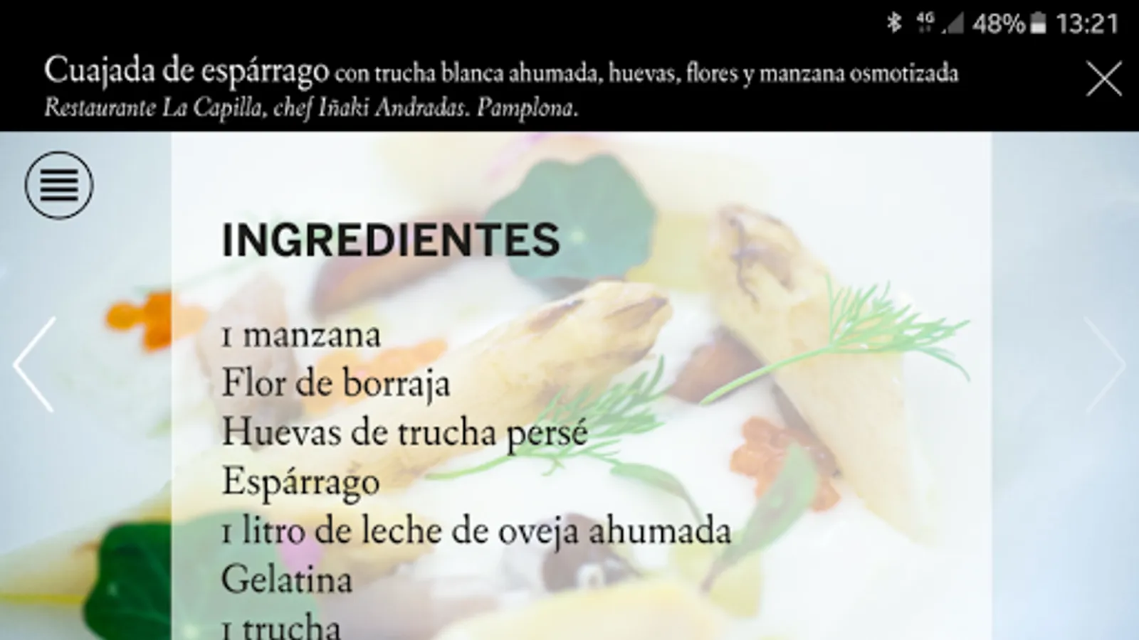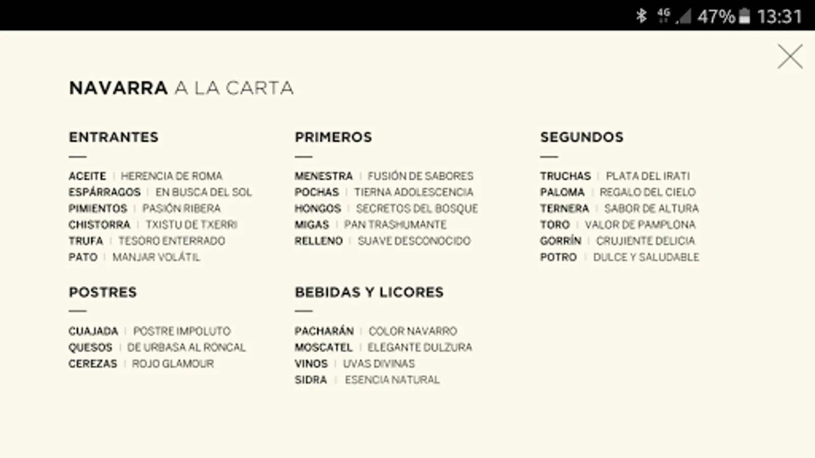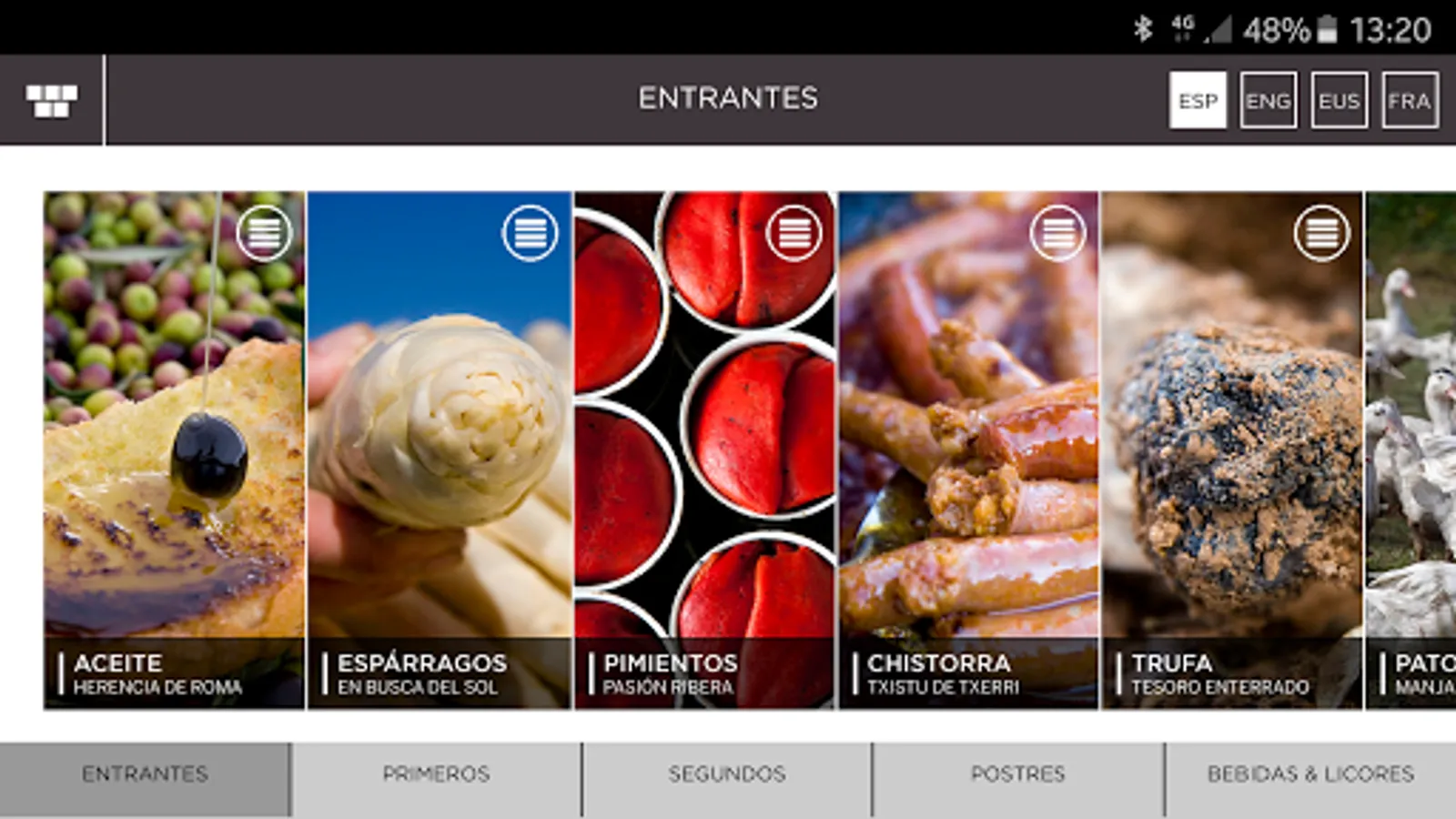 In addition to collecting information from the book, the new App includes new chapters, such as those devoted to cider or meat pony, unpublished photographs and videos of some of the most emblematic Navarran cuisine such as asparagus of Navarra products, piquillo Lodosa, or Pacharán Navarro, among others. Thus, over a photo of an ancient olive tree-index menu appears with five sections: Starters, First, Second, desserts and drinks and spirits. Each is composed of different dishes which in turn invite you to make a tourist trip - Gourmet Navarra to the area where the product is made.